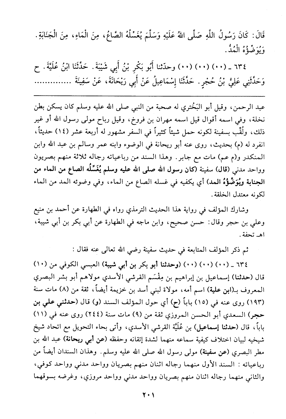 عبد الرحمن، وقيل أبو البَخْتري له صحبة من النبي صلى الله عليه وسلم كان يسكن بطن نخلة، وفي اسمه أقوال قيل اسمه مهران بن فروخ، وقيل رباح مولى رسول الله أو غير ذلك، ولُقِّب بسفينة لكونه حمل شيئًا كثيرًا في السفر مشهور له أربعة عشر (١٤) حديثًا، انفرد له (م) بحديث، روى عنه أبو ريحانة في الوضوء وابنه عمر وسالم بن عبد الله وابن المنكدر و (م عم) مات مع جابر. وهذا السند من رباعياته رجاله ثلاثة منهم بصريون وواحد مدني (قال) سفينة (كان رسول الله صلى الله عليه وسلم يُغَسِّلُه الصاع من الماء من الجنابة ويُوَضِّؤُهُ المد) أي يكفيه في غسله الصاع من الماء، وفي وضوئه المد من الماء لكونه معتدل الخلقة.