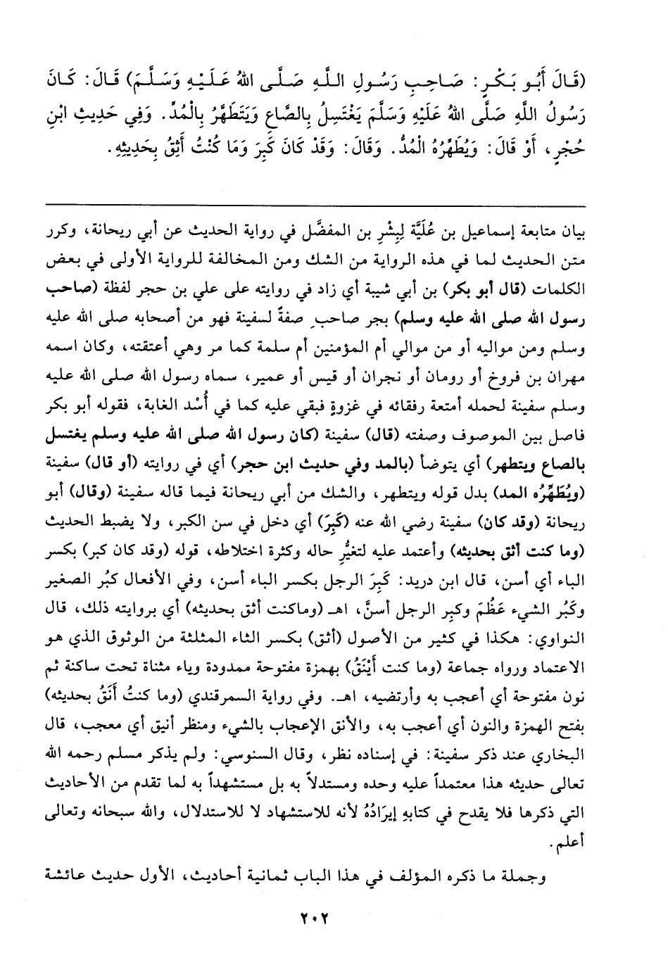 (قَال أَبُو بَكْرٍ: صَاحِبِ رَسُولِ اللهِ صَلَّى اللهُ عَلَيهِ وَسَلَّمَ) قَال: كَانَ رَسُولُ اللهِ صَلَّى اللهُ عَلَيهِ وَسَلَّمَ يَغْتَسِلُ بِالصَّاعِ وَيتَطَهَّرُ بِالْمُدِّ. وَفِي حَدِيثِ ابْنِ حُجْرٍ، أَوْ قَال: ويطَهِّرُهُ الْمُدُّ. وَقَال: وَقَدْ كَانَ كَبِرَ وَمَا كُنْتُ أَثِقُ بِحَدِيثِهِ