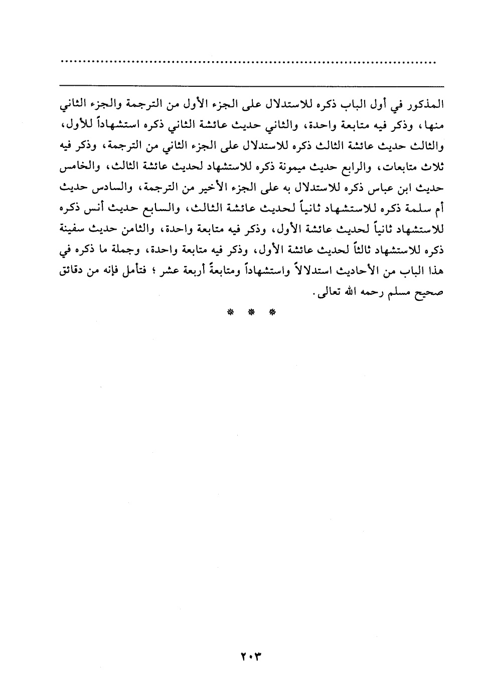 المذكور في أول الباب ذكره للاستدلال على الجزء الأول من الترجمة والجزء الثاني منها، وذكر فيه متابعة واحدة، والثاني حديث عائشة الثاني ذكره استشهادًا للأول، والثالث حديث عائشة الثالث ذكره للاستدلال على الجزء الثاني من الترجمة، وذكر فيه ثلاث متابعات، والرابع حديث ميمونة ذكره للاستشهاد لحديث عائشة الثالث، والخامس حديث ابن عباس ذكره للاستدلال به على الجزء الأخير من الترجمة، والسادس حديث أم سلمة ذكره للاستشهاد ثانيًا لحديث عائشة الثالث، والسابع حديث أنس ذكره للاستشهاد ثانيًا لحديث عائشة الأول، وذكر فيه متابعة واحدة، والثامن حديث سفينة ذكره للاستشهاد ثالثًا لحديث عائشة الأول، وذكر فيه متابعة واحدة، وجملة ما ذكره في هذا الباب من الأحاديث استدلالًا واستشهادًا ومتابعةً أربعة عشر؛ فتأمل فإنه من دقائق صحيح مسلم رحمه الله تعالى.