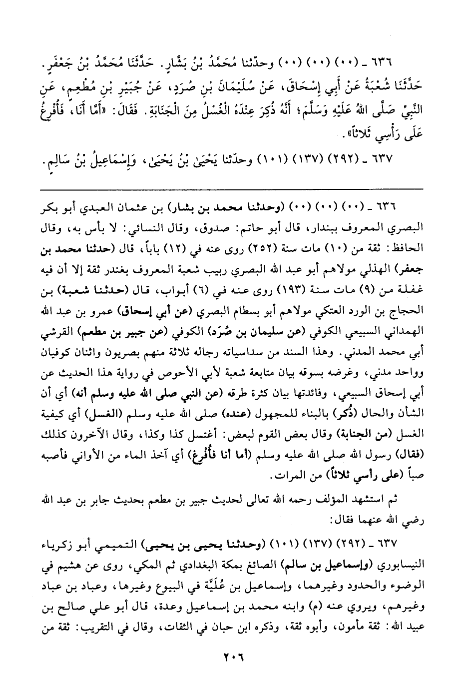 ٦٣٦ - (٠٠) (٠٠) (٠٠) (وحدثنا محمد بن بشار) بن عثمان العبدي أبو بكر البصري المعروف ببندار، قال أبو حاتم: صدوق، وقال النسائي: لا بأس به، وقال الحافظ: ثقة من (١٠) مات سنة (٢٥٢) روى عنه في (١٢) بابا، قال (حدثنا محمد بن جعفر) الهذلي مولاهم أبو عبد الله البصري ربيب شعبة المعروف بغندر ثقة إلَّا أن فيه غفلة من (٩) مات سنة (١٩٣) روى عنه في (٦) أبواب، قال (حدثنا شعبة) بن الحجاج بن الورد العتكي مولاهم أبو بسطام البصري (عن أبي إسحاق) عمرو بن عبد الله الهمداني السبيعي الكوفي (عن سليمان بن صُرَد) الكوفي (عن جبير بن مطعم) القرشي أبي محمد المدني. وهذا السند من سداسياته رجاله ثلاثة منهم بصريون واثنان كوفيان وواحد مدني، وغرضه بسوقه بيان متابعة شعبة لأبي الأحوص في رواية هذا الحديث عن أبي إسحاق السبيعي، وفائدتها بيان كثرة طرقه (عن النبي صلى الله عليه وسلم أنَّه) أي أن الشأن والحال (ذُكر) بالبناء للمجهول (عنده) صلى الله عليه وسلم (الغسل) أي كيفية الغسل (من الجنابة) وقال بعض القوم لبعض: أغتسل كذا وكذا، وقال الآخرون كذلك (فقال) رسول الله صلى الله عليه وسلم (أما أنا فأُفْرِغُ) أي آخذ الماء من الأواني فأصبه صبًّا (على رأسي ثلاثًا) من المرات.