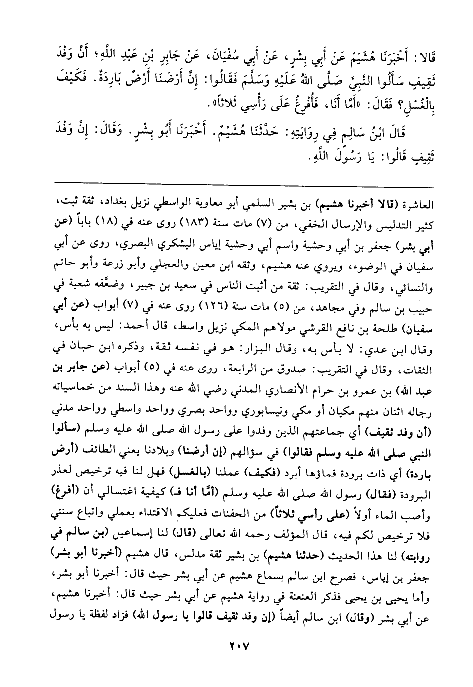 قَالا: أَخْبَرَنَا هُشَيمٌ عَنْ أَبِي بِشْرٍ، عَنْ أَبِي سُفْيَانَ، عَنْ جَابِرِ بْنِ عَبْدِ اللهِ؛ أن وَفْدَ ثَقِيفِ سَأَلُوا النَّبِيّ صَلَّى اللهُ عَلَيهِ وَسَلَّمَ فَقَالُوا: إِن أَرْضَنَا أَرْضٌ بَارِدَةٌ. فَكَيفَ بِالْغُسْلِ؟ فَقَال: "أمَّا أَنَا، فَأُفْرِغُ عَلَى رَأْسِي ثَلاثًا".