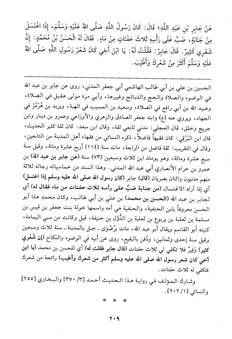 عَنْ جَابِرِ بْنِ عَبْدِ اللهِ؛ قَال: كَانَ رَسُولُ اللهِ صَلَّى اللهُ عَلَيهِ وَسَلَّمَ، إِذَا اغْتَسَلَ مِنْ جَنَابَةٍ، صَبَّ عَلَى رَأْسِهِ ثَلاثَ حَفَنَاتٍ مِنْ مَاءٍ. فَقَال لَهُ الْحَسَنُ بْنُ مُحَمَّدٍ: إِنَّ شَعْرِي كَثِيرٌ. قَال جَابِرٌ: فَقُلْتُ لَهُ: يَا ابْنَ أَخِي كَانَ شَعْرُ رَسُولِ اللَّهِ صَلَّى اللهُ عَلَيهِ وَسَلَّمَ أَكْثَرَ مِنْ شَعْرِكَ وَأَطْيَبَ