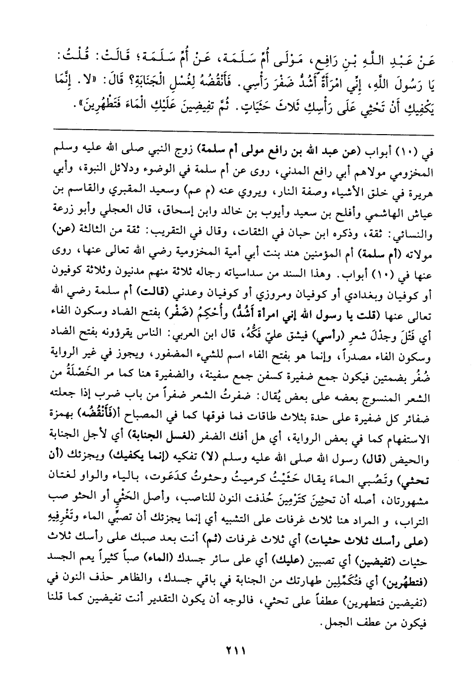 في (١٠) أبواب (عن عبد الله بن رافع مولى أم سلمة) زوج النبي صلى الله عليه وسلم المخزومي مولاهم أبي رافع المدني، روى عن أم سلمة في الوضوء ودلائل النبوة، وأبي هريرة في خلق الأشياء وصفة النار، ويروي عنه (م عم) وسعيد المقبري والقاسم بن عياش الهاشمي وأفلح بن سعيد وأيوب بن خالد وابن إسحاق، قال العجلي وأبو زرعة والنسائي: ثقة، وذكره ابن حبان في الثقات، وقال في التقريب: ثقة من الثالثة (عن) مولاته (أم سلمة) أم المؤمنين هند بنت أبي أمية المخزومية رضي الله تعالى عنها، روى عنها في (١٠) أبواب. وهذا السند من سداسياته رجاله ثلاثة منهم مدنيون وثلاثة كوفيون أو كوفيان وبغدادي أو كوفيان ومروزي أو كوفيان وعدني (قالت) أم سلمة رضي الله تعالى عنها (قلت يا رسول الله إني امرأة أَشُدُّ) وأُحْكِمُ (ضَفْر) بفتح الضاد وسكون الفاء أي فَتْلَ وجدْلَ شعرِ (رأسي) فيشق علي فَكُّهُ، قال ابن العربي: الناس يقرؤونه بفتح الضاد وسكون الفاء مصدرًا، وإنما هو بفتح الفاء اسم للشيء المضفور، ويجوز في غير الرواية ضُفُر بضمتين فيكون جمع ضفيرة كسفن جمع سفينة، والضفيرة هنا كما مر الخَصْلَةُ من الشعر المنسوج بعضه على بعض يُقال: ضفرتُ الشعر ضفرًا من باب ضرب إذا جعلته ضفائر كل ضفيرة على حدة بثلاث طاقات فما فوقها كما في المصباح أ (فَأَنْقُضُه) بهمزة الاستفهام كما في بعض الرواية، أي هل أفك الضفر (لغسل الجنابة) أي لأجل الجنابة والحيض (قال) رسول الله صلى الله عليه وسلم (لا) تفكيه (إنما يكفيك) ويجزئك (أن تحثي) وتَصُبي الماءَ يقال حَثَيتُ كرميتُ وحثوتُ كدَعَوت، بالياء والواو لغتان مشهورتان، أصله أن تحثِينَ كتَرْمِينَ حُذفت النون للناصب، وأصل الحَثْي أو الحثو صب التراب، والمراد هنا ثلاث غرفات على التشبيه أي إنما يجزئك أن تصبِّي الماء وتَغْرِفِيهِ (على رأسك ثلاث حثيات) أي ثلاث غرفات (ثم) أنت بعد صبك على رأسك ثلاث حثيات (تفيضين) أي تصبين (عليك) أي على سائر جسدك (الماء) صبًا كثيرًا يعم الجسد (فتطهُرين) أي فتُكَمِّلِين طهارتك من الجنابة في باقي جسدك، والظاهر حذف النون في (تفيضين فتطهرين) عطفًا على تحثي، فالوجه أن يكون التقدير أنت تفيضين كما قلنا فيكون من عطف الجمل.