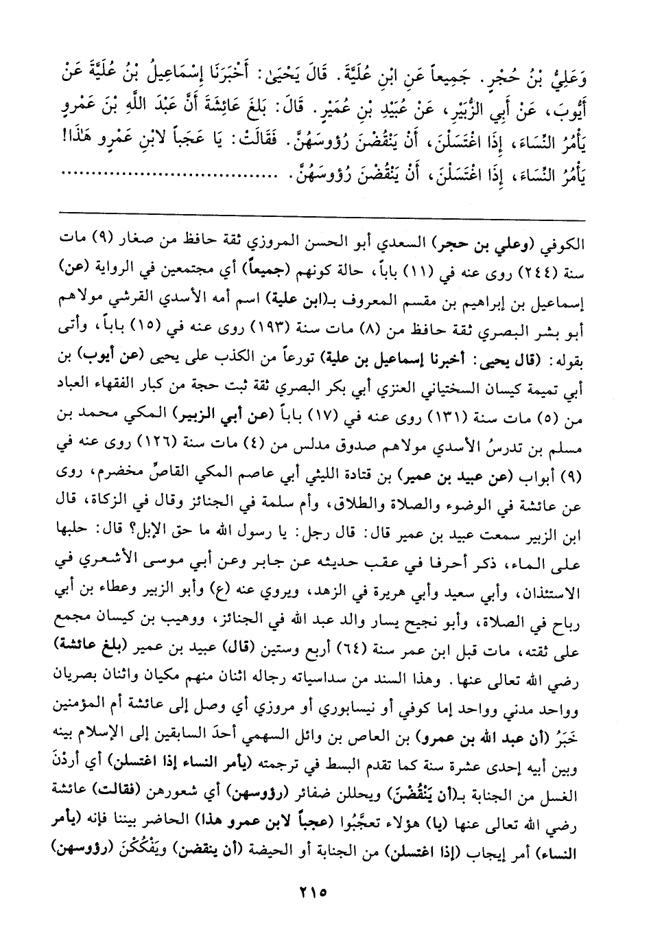 الكوفي (وعلي بن حجر) السعدي أبو الحسن المروزي ثقة حافظ من صغار (٩) مات سنة (٢٤٤) روى عنه في (١١) بابا، حالة كونهم (جميعًا) أي مجتمعين في الرواية (عن) إسماعيل بن إبراهيم بن مقسم المعروف بـ (ابن علية) اسم أمه الأسدي القرشي مولاهم أبو بشر البصري ثقة حافظ من (٨) مات سنة (١٩٣) روى عنه في (١٥) بابا، وأتى بقوله: (قال يحيى: أخبرنا إسماعيل بن علية) تورعًا من الكذب على يحيى (عن أيوب) بن أبي تميمة كيسان السختياني العنزي أبي بكر البصري ثقة ثبت حجة من كبار الفقهاء العباد من (٥) مات سنة (١٣١) روى عنه في (١٧) بابا (عن أبي الزبير) المكي محمد بن مسلم بن تدرسُ الأسدي مولاهم صدوق مدلس من (٤) مات سنة (١٢٦) روى عنه في (٩) أبواب (عن عبيد بن عمير) بن قتادة الليثي أبي عاصم المكي القاصِّ مخضرم، روى عن عائشة في الوضوء والصلاة والطلاق، وأم سلمة في الجنائز وقال في الزكاة، قال ابن الزبير سمعت عبيد بن عمير قال: قال رجل: يا رسول الله ما حق الإبل؟ قال: حلبها على الماء، ذكر أحرفا في عقب حديثه عن جابر وعن أبي موسى الأشعري في الاستئذان، وأبي سعيد وأبي هريرة في الزهد، ويروي عنه (ع) وأبو الزبير وعطاء بن أبي رباح في الصلاة، وأبو نجيح يسار والد عبد الله في الجنائز، ووهيب بن كيسان مجمع على ثقته، مات قبل ابن عمر سنة (٦٤) أربع وستين (قال) عبيد بن عمير (بلغ عائشة) رضي الله تعالى عنها. وهذا السند من سداسياته رجاله اثنان منهم مكيان واثنان بصريان وواحد مدني وواحد إما كوفي أو نيسابوري أو مروزي أي وصل إلى عائشة أم المؤمنين خَبَرُ (أن عبد الله بن عمرو) بن العاص بن وائل السهمي أحدَ السابقين إلى الإسلام بينه وبين أبيه إحدى عشرة سنة كما تقدم البسط في ترجمته (يأمر النساء إذا اغتسلن) أي أردْنَ الغسل من الجنابة بـ (أن يَنْقُضْنَ) ويحللن ضفائر (رؤوسهن) أي شعورهن (فقالت) عائشة رضي الله تعالى عنها (يا) هؤلاء تعجَّبُوا (عجبًا لابن عمرو هذا) الحاضر بيننا فإنه (يأمر النساء) أمر إيجاب (إذا اغتسلن) من الجنابة أو الحيضة (أن ينقضن) ويَفْكُكْنَ (رؤوسهن)