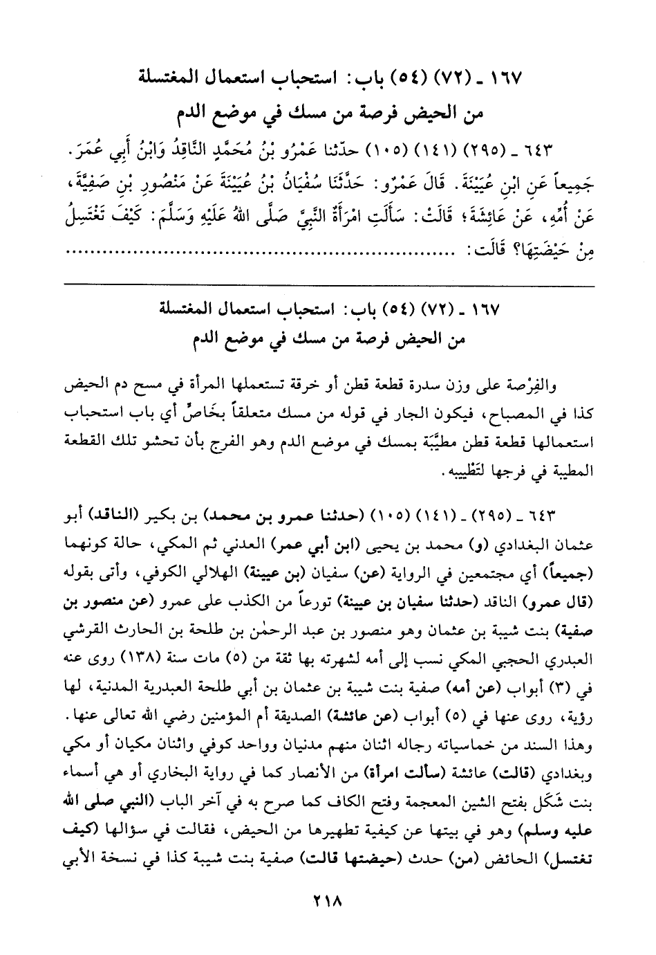٦٤٣ - (٢٩٥) (١٤١) (١٠٥) حدَّثنا عَمْرُو بْنُ مُحَمَّدٍ النَّاقِدُ وَابْنُ أَبِي عُمَرَ. جَمِيعًا عَنِ ابْنِ عُيَينَةَ. قَال عَمْرٌو: حَدَّثَنَا سُفْيَانُ بْنُ عُيَينَةَ عَنْ مَنْصُورِ بْنِ صَفِيَّةَ، عَنْ أُمِّهِ، عَنْ عَائِشَةَ؛ قَالتْ: سَأَلَتِ امْرَأَةٌ النَّبِيَّ صَلَّى اللهُ عَلَيهِ وَسَلَّمَ: كَيفَ تَغْتَسِلُ مِنْ حَيضَتِهَا؟ قَالت: