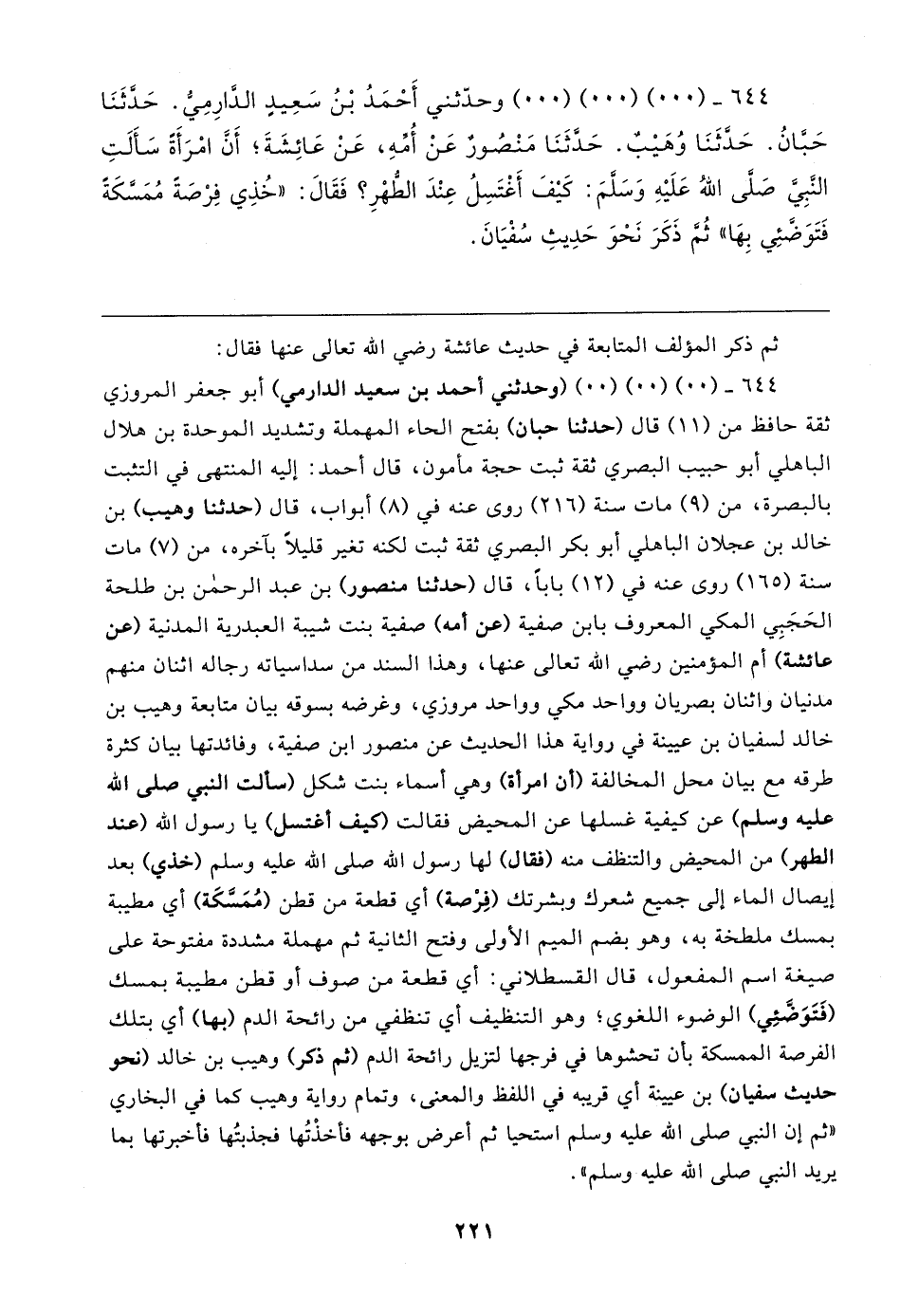 ٦٤٤ - (٠٠) (٠٠) (٠٠) (وحدثني أحمد بن سعيد الدارمي) أبو جعفر المروزي ثقة حافظ من (١١) قال (حَدَّثَنَا حبان) بفتح الحاء المهملة وتشديد الموحدة بن هلال الباهلي أبو حبيب البصري ثقة ثبت حجة مأمون، قال أحمد: إليه المنتهى في التثبت بالبصرة، من (٩) مات سنة (٢١٦) روى عنه في (٨) أبواب، قال (حَدَّثَنَا وهيب) بن خالد بن عجلان الباهلي أبو بكر البصري ثقة ثبت لكنه تغير قليلًا بآخره، من (٧) مات سنة (١٦٥) روى عنه في (١٢) بابا، قال (حَدَّثَنَا منصور) بن عبد الرحمن بن طلحة الحَجَبِي المكي المعروف بابن صفية (عن أمه) صفية بنت شيبة العبدرية المدنية (عن عائشة) أم المؤمنين رضي الله تعالى عنها، وهذا السند من سداسياته رجاله اثنان منهم مدنيان واثنان بصريان وواحد مكي وواحد مروزي، وغرضه بسوقه بيان متابعة وهيب بن خالد لسفيان بن عيينة في رواية هذا الحديث عن منصور ابن صفية، وفائدتها بيان كثرة طرقه مع بيان محل المخالفة (أن امرأة) وهي أسماء بنت شكل (سألت النبي صلى الله عليه وسلم) عن كيفية غسلها عن المحيض فقالت (كيف أغتسل) يا رسول الله (عند الطهر) من المحيض والتنفظ منه (فقال) لها رسول الله صلى الله عليه وسلم (خذي) بعد إيصال الماء إلى جميع شعرك وبشرتك (فِرْصة) أي قطعة من قطن (مُمَسَّكَة) أي مطيبة بمسك ملطخة به، وهو بضم الميم الأولى وفتح الثانية ثم مهملة مشددة مفتوحة على صيغة اسم المفعول، قال القسطلاني: أي قطعة من صوف أو قطن مطيبة بمسك (فَتَوَضَّئِي) الوضوء اللغوي؛ وهو التنظيف أي تنظفي من رائحة الدم (بها) أي بتلك الفرصة الممسكة بأن تحشوها في فرجها لتزيل رائحة الدم (ثم ذكر) وهيب بن خالد (نحو حديث سفيان) بن عيينة أي قريبه في اللفظ والمعنى، وتمام رواية وهيب كما في البخاري "ثم إن النبي صلى الله عليه وسلم استحيا ثم أعرض بوجهه فأخذْتُها فجذبتُها فأخبرتها بما يريد النبي صلى الله عليه وسلم".