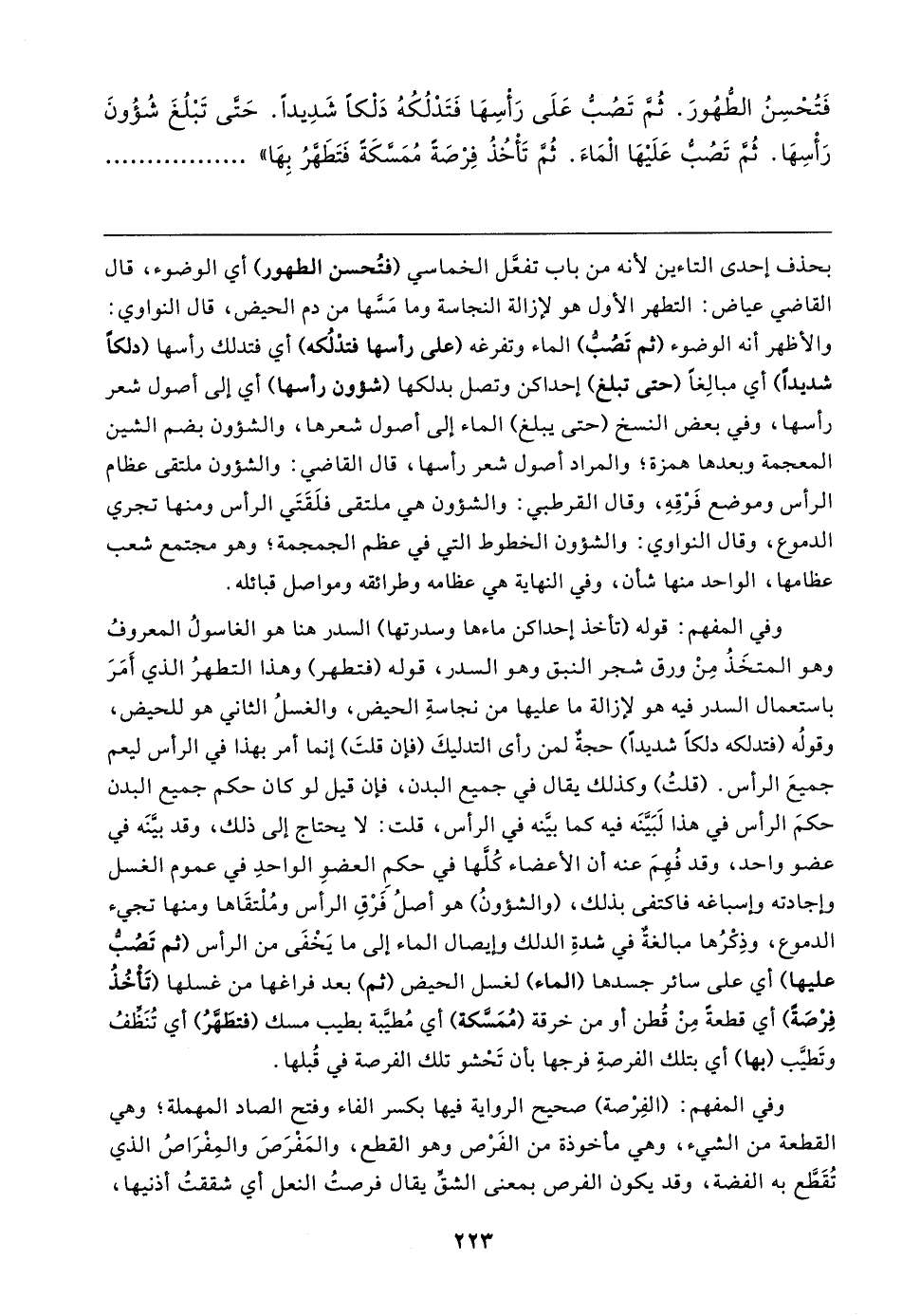 وفي المفهم: قوله (تأخذ إحداكن ماءها وسدرتها) السدر هنا هو الغاسولُ المعروفُ وهو المتخَذُ مِنْ ورق شجر النبق وهو السدر، قوله (فتطهر) وهذا التطهرُ الَّذي أَمَرَ باستعمال السدر فيه هو لإزالة ما عليها من نجاسةِ الحيض، والغسلُ الثاني هو للحيض، وقولُه (فتدلكه دلكًا شديدًا) حجةٌ لمن رأى التدليكَ (فإن قلتَ) إنما أمر بهذا في الرأس ليعم جميعَ الرأس. (قلتُ) وكذلك يقال في جميع البدن، فإن قيل لو كان حكم جميع البدن حكمَ الرأس في هذا لبَيَّنَه فيه كما بيَّنه في الرأس، قلت: لا يحتاج إلى ذلك، وقد بيَّنَه في عضو واحد، وقد فُهِمَ عنه أن الأعضاء كُلَّها في حكمِ العضو الواحدِ في عموم الغسل وإجادته وإسباغه فاكتفى بذلك، (والشؤونُ) هو أصلُ فَرْقِ الرأس ومُلْتقَاها ومنها تجيء الدموع، وذِكْرُها مبالغةٌ في شدةِ الدلك وإيصال الماء إلى ما يَخْفَى من الرأس (ثم تَصُبُّ عليها) أي على سائر جسدها (الماء) لغسل الحيض (ثم) بعد فراغها من غسلها (تَأْخُذُ فِرْصَةً) أي قطعةً مِنْ قُطن أو من خرقة (مُمَسَّكة) أي مُطيَّبة بطيب مسك (فتطَهَّرُ) أي تُنَظِّفُ وتَطيِّب (بها) أي بتلك الفرصةِ فرجها بأن تَحْشو تلك الفرصة في قُبلها.