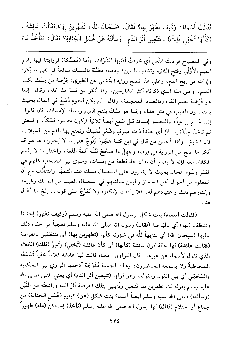 وفي المصباح فرصتُ النَّعل أي خرقتُ أذنيها للشِّرَاك، وأما (مُمسَّكة) فروايتنا فيها بضم الميم الأُوْلَى وفتحِ الثانية وتشديد السين؛ ومعناه مطيَّبَة بالمسك مبالغةً في نفي ما يُكره وإزالتِهِ من ريح الدم، وعلى هذا تصح رواية الخُشني عن الطبري: فِرْصة من مِسْك بكسر الميم، وعلى هذا الَّذي ذكرناه أكثر الشارحين، وقد أنكر ابن قتيبة هذا كله، وقال: إنما هو فُرْضَة بضم الفاء وبالضاد المعجمة، وقال: لم يكن للقوم وُسْع في المال بحيث يستعملون الطيب في مثل هذا، وإنما هو مَسْكٌ بفتح الميم ومعناه الإمساك، فإن قالوا: إنما سُمع رباعيًّا، والمصدر إمساك قيل سُمع أيضًا ثلاثيًّا فيكون مصدره مَسْكًا، والمعنى ثم تأخذ جِلْدَةَ إمساكِ أي جلدةَ ذات صوفٍ وشَعْرٍ تُمْسِكُ وتمنع بها الدم من السيلان، قال الشيح: ولقد أحسن من قال في ابن قتيبة هَجُومٌ وَلُوجٌ على ما لا يُحسِن، ها هو قد أنكر ما صح من الرواية في فِرصة وجهِلَ ما صحَّحَ نَقْلَه أئمةُ اللغة، واختار ما لا يلتئم الكلام معه فإنه لا يصح أن يقال خذ قطعة من إمساك، وسوى بين الصحابة كلهم في الفقر وسُوءِ الحال بحيث لا يقدرون على استعمال مِسك عند التطهُر والتنظُّف مع أن المعلوم من أحوال أهل الحجاز واليمن مبالغتهم في استعمال الطيب من المسك وغيره، وإكثارهم ذلك واعتيادهم له، فلا يلتفت لإنكاره ولا يُعَرَّجُ على قوله .. إلخ ما أطال هنا.