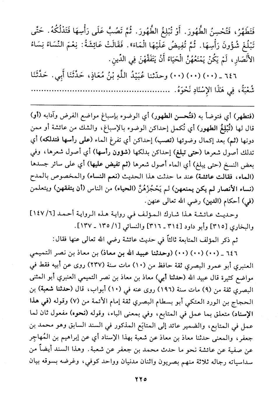 ٦٤٦ - (٠٠) (٠٠) (٠٠) (وحدثنا عبيد الله بن معاذ) بن معاذ بن نصر التميمي العنبري أبو عمرو البصري ثقة حافظ من (١٠) مات سنة (٢٣٧) روى عن أبيه فقط في مواضع كثيرة قال عبيد الله (حَدَّثَنَا أبي) معاذ بن معاذ بن نصر التميمي العنبري أبو المثنى البصري ثقة من (٩) مات سنة (١٩٦) روى عنه في (١٠) أبواب، قال (حَدَّثَنَا شعبة) بن الحجاج بن الورد العتكي أبو بسطام البصري ثقة إمام الأئمة من (٧) وقوله (في هذا الإسناد) متعلق بما عمل في المتابع، وفي بمعنى الباء، وقوله (نحوه) مفعول ثان لما عمل في المتابع، والضمير عائد إلى المتابَع المذكور في السند السابق وهو محمد بن جعفر، والمعنى حَدَّثَنَا معاذ بن معاذ عن شعبة بهذا الإسناد أي عن إبراهيم بن المُهاجِر عن صفية عن عائشة نحو ما حدث محمد بن جعفر عن شعبة. وهذا السند أيضًا من سداسياته رجاله ثلاثة منهم بصريون واثنان مدنيان وواحد كوفي، وغرضه بسوقه بيان