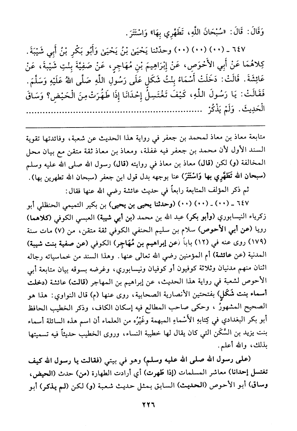 ٦٤٧ - (٠٠) (٠٠) (٠٠) وحدَّثنا يَحْيَى بْنُ يَحْيَى وَأَبُو بَكْرِ بْنُ أَبِي شَيبَةَ. كِلاهُمَا عَنْ أَبِي الأحوَصِ، عَنْ إِبْرَاهِيمَ بْنِ مُهَاجِرٍ، عَنْ صَفِيَّةَ بِنْتِ شَيبةَ، عَنْ عَائِشَةَ. قَالتْ: دَخَلَتْ أَسْمَاءُ بِنْتُ شَكَلٍ عَلَى رَسُولِ اللهِ صَلَّى اللهُ عَلَيهِ وَسَلَّمَ. فَقَالتْ: يَا رَسُولَ اللهِ، كَيفَ تَغْتَسِلُ إِحْدَانَا إِذَا طَهُرَت مِنَ الْحَيضِ؟ وَسَاقَ الْحَدِيثَ. وَلَمْ يَذْكُرْ