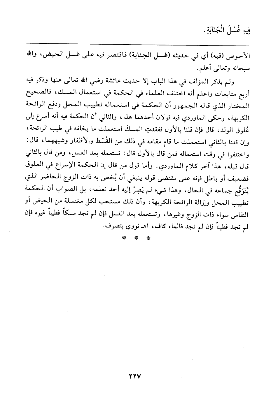 ولم يذكر المؤلف في هذا الباب إلَّا حديث عائشة رضي الله تعالى عنها وذكر فيه أربع متابعات واعلم أنَّه اختلف العلماء في الحكمة في استعمال المسك، فالصحيح المختار الَّذي قاله الجمهور أن الحكمة في استعماله تطييب المحل ودفع الرائحة الكريهة، وحكى الماوردي فيه قولان أحدهما هذا، والثاني أن الحكمة فيه أنَّه أسرع إلى عُلوق الولد، قال فإن قلنا بالأول ففقدتِ المسكَ استعملت ما يخلفه في طيب الرائحة، وإن قلنا بالثاني استعملت ما قام مقدمه في ذلك من القُسْط والأظفار وشبههما، قال: واختلفوا في وقت استعماله فمن قال بالأول قال: تستعمله بعد الغسل، ومن قال بالثاني قال قبله، هذا آخر كلام الماوردي. وأما قول من قال إن الحكمة الإسراع في العلوق فضعيف أو باطل فإنه على مقتضى قوله ينبغي أن يُخص به ذات الزوج الحاضر الَّذي يُتَوَقَّع جماعه في الحال، وهذا شيء لم يَصِرْ إليه أحد نعلمه، بل الصواب أن الحكمة تطييب المحل وإزالة الرائحة الكريهة، وأن ذلك مستحب لكل مغتسلة من الحيض أو النفاس سواء ذات الزوج وغيرها، وتستعمله بعد الغسل فإن لم تجد مسكًا فطيبًا غيره فإن لم تجد فطينًا فإن لم تجد فالماء كاف، اهـ نووي بتصرف.