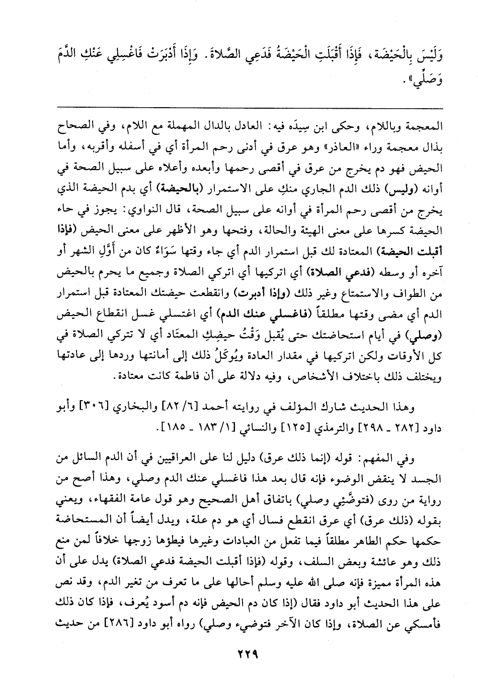 وفي المفهم: قوله (إنما ذلك عرق) دليل لنا على العراقيين في أن الدم السائل من الجسد لا ينقض الوضوء فإنه قال بعد هذا فاغسلي عنك الدم وصلي، وهذا أصح من رواية من روى (فتوضَّئِي وصلي) باتفاق أهل الصحيح وهو قول عامة الفقهاء، ويعني بقوله (ذلك عرق) أي عرق انقطع فسال أي هو دم علة، ويدل أيضًا أن المستحاضة حكمها حكم الطاهر مطلقًا فيما تفعل من العبادات وغيرها فيطؤها زوجها خلافًا لمن منع ذلك وهو عائشة وبعض السلف، وقوله (فإذا أقبلت الحيضة فدعي الصلاة) يدل على أن هذه المرأة مميزة فإنه صلى الله عليه وسلم أحالها على ما تعرف من تغير الدم، وقد نص على هذا الحديث أبو داود فقال (إذا كان دم الحيض فإنه دم أسود يُعرف، فإذا كان ذلك فأمسكي عن الصلاة، وإذا كان الآخر فتوضيء وصلي) رواه أبو داود [٢٨٦] من حديث