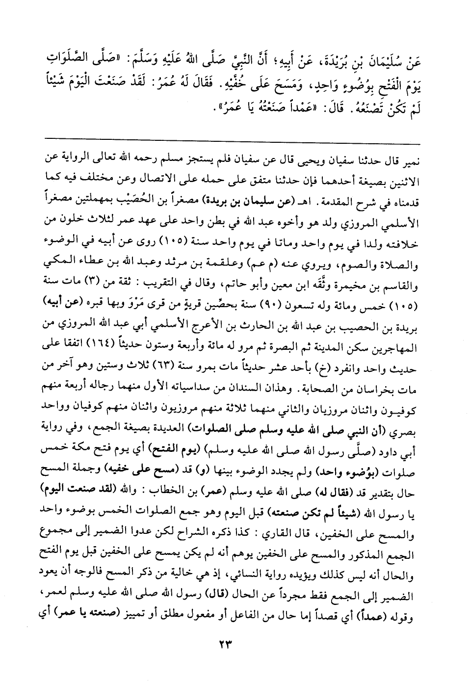 عَنْ سُلَيمَانَ بْنِ بُرَيدَةَ، عَنْ أَبِيهِ، أَن النبِيَّ صَلى اللهُ عَلَيهِ وَسَلمَ: "صَلَّى الصَّلَوَاتِ يَوْمَ الْفَتْحِ بِوُضُوءٍ وَاحِدٍ، وَمَسَحَ عَلَى خُفيهِ. فَقَال لَهُ عُمَرُ: لَقَد صَنعتَ الْيَوْمَ شَيئًا لَمْ تَكُنْ تَصْنَعُهُ. قَال: "عَمدًا صَنَعْتُهُ يَا عُمَرُ"