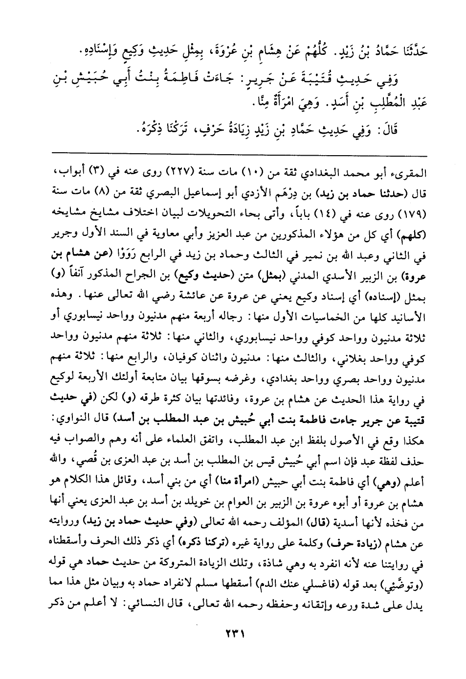 المقرئ أبو محمد البغدادي ثقة من (١٠) مات سنة (٢٢٧) روى عنه في (٣) أبواب، قال (حدثنا حماد بن زيد) بن دِرْهَم الأزدي أبو إسماعيل البصري ثقة من (٨) مات سنة (١٧٩) روى عنه في (١٤) بابا، وأتى بحاء التحويلات لبيان اختلاف مشايخ مشايخه (كلهم) أي كل من هؤلاء المذكورين من عبد العزيز وأبي معاوية في السند الأول وجرير في الثاني وعبد الله بن نمير في الثالث وحماد بن زيد في الرابع رَوَوْا (عن هشام بن عروة) بن الزبير الأسدي المدني (بمثل) متن (حديث وكيع) بن الجراح المذكور آنفًا (و) بمثل (إسناده) أي إسناد وكيع يعني عن عروة عن عائشة رضي الله تعالى عنها. وهذه الأسانيد كلها من الخماسيات الأول منها: رجاله أربعة منهم مدنيون وواحد نيسابوري أو ثلاثة مدنيون وواحد كوفي وواحد نيسابوري، والثاني منها: ثلاثة منهم مدنيون وواحد كوفي وواحد بغلاني، والثالث منها: مدنيون واثنان كوفيان، والرابع منها: ثلاثة منهم مدنيون وواحد بصري وواحد بغدادي، وغرضه بسوقها بيان متابعة أولئك الأربعة لوكيع في رواية هذا الحديث عن هشام بن عروة، وفائدتها بيان كثرة طرقه (و) لكن (في حديث قتيبة عن جرير جاءت فاطمة بنت أبي حُبيش بن عبد المطلب بن أسد) قال النواوي: هكذا وقع في الأصول بلفظ ابن عبد المطلب، واتفق العلماء على أنه وهم والصواب فيه حذف لفظة عبد فإن اسم أبي حُبيش قيس بن المطلب بن أسد بن عبد العزى بن قُصي، والله أعلم (وهي) أي فاطمة بنت أبي حبيش (امرأة منا) أي من بني أسد، وقائل هذا الكلام هو هشام بن عروة أو أبوه عروة بن الزبير بن العوام بن خويلد بن أسد بن عبد العزى يعني أنها من فخذه لأنها أسدية (قال) المؤلف رحمه الله تعالى (وفي حديث حماد بن زيد) وروايته عن هشام (زيادة حرف) وكلمة على رواية غيره (تركنا ذكره) أي ذكر ذلك الحرف وأسقطناه في روايتنا عنه لأنه انفرد به وهي شاذة، وتلك الزيادة المتروكة من حديث حماد هي قوله (وتوضئِي) بعد قوله (فاغسلي عنك الدم) أسقطها مسلم لانفراد حماد به وبيان مثل هذا مما يدل على شدة ورعه وإتقانه وحفظه رحمه الله تعالى، قال النسائي: لا أعلم من ذكر