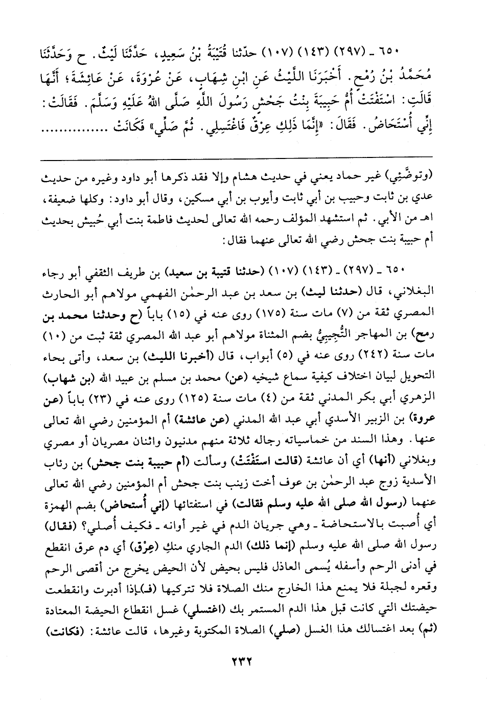 ٦٥٠ - (٢٩٧) - (١٤٣) (١٠٧) (حدثنا قتيبة بن سعيد) بن طريف الثقفي أبو رجاء البغلاني، قال (حدثنا ليث) بن سعد بن عبد الرحمن الفهمي مولاهم أبو الحارث المصري ثقة من (٧) مات سنة (١٧٥) روى عنه في (١٥) بابا (ح وحدثنا محمد بن رمح) بن المهاجر التُجِيبِيُّ بضم المثناة مولاهم أبو عبد الله المصري ثقة ثبت من (١٠) مات سنة (٢٤٢) روى عنه في (٥) أبواب، قال (أخبرنا الليث) بن سعد، وأتى بحاء التحويل لبيان اختلاف كيفية سماع شيخيه (عن) محمد بن مسلم بن عبيد الله (بن شهاب) الزهري أبي بكر المدني ثقة من (٤) مات سنة (١٢٥) روى عنه في (٢٣) بابا (عن عروة) بن الزبير الأسدي أبي عبد الله المدني (عن عائشة) أم المؤمنين رضي الله تعالى عنها. وهذا السند من خماسياته رجاله ثلاثة منهم مدنيون واثنان مصريان أو مصري وبغلاني (أنها) أي أن عائشة (قالت استَفْتَتْ) وسألت (أم حبيبة بنت جحش) بن رئاب الأسدية زوج عبد الرحمن بن عوف أخت زينب بنت جحش أم المؤمنين رضي الله تعالى عنهما (رسول الله صلى الله عليه وسلم فقالت) في استفتائها (إني أُستحاض) بضم الهمزة أي أُصبت بالاستحاضة -وهي جريان الدم في غير أوانه- فكيف أُصلي؟ (فقال) رسول الله صلى الله عليه وسلم (إنما ذلك) الدم الجاري منكِ (عِرْق) أي دم عرق انقطع في أدنى الرحم وأسفله يُسمى العاذل فليس بحيض لأن الحيض يخرج من أقصى الرحم وقعره لجبلة فلا يمنع هذا الخارج منك الصلاة فلا تتركيها (فـ) ـإذا أدبرت وانقطعت حيضتك التي كانت قبل هذا الدم المستمر بك (اغتسلي) غسل انقطاع الحيضة المعتادة (ثم) بعد اغتسالك هذا الغسل (صلي) الصلاة المكتوبة وغيرها، قالت عائشة: (فكانت)