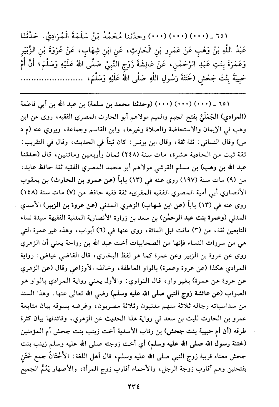 ٦٥١ - (٠٠) (٠٠) (٠٠) (وحدثنا محمد بن سلمة) بن عبد الله بن أبي فاطمة (المرادي) الجَمَلَيُّ بفتح الجيم والميم مولاهم أبو الحارث المصري الفقيه، روى عن ابن وهب في الإيمان والاستحاضة والصلاة وغيرها، وابن القاسم وجماعة، ويروي عنه (م د س) وقال النسائي: ثقة ثقة، وقال ابن يونس: كان ثبتًا في الحديث، وقال في التقريب: ثقة ثبت من الحادية عشرة، مات سنة (٢٤٨) ثمان وأربعين ومائتين، قال (حدثنا عبد الله بن وهب) بن مسلم القرشي مولاهم أبو محمد المصري الفقيه ثقة حافظ عابد، من (٩) مات سنة (١٩٧) روى عنه في (١٣) بابا (عن عمرو بن الحارث) بن يعقوب الأنصاري أبي أمية المصري الفقيه المقرئ ثقة فقيه حافظ من (٧) مات سنة (١٤٨) روى عنه في (١٣) بابا (عن ابن شهاب) الزهري المدني (عن عروة بن الزبير) الأسدي المدني (وعمرة بنت عبد الرحمن) بن سعد بن زرارة الأنصارية المدنية الفقيهة سيدة نساء التابعين ثقة، من (٣) ماتت قبل المائة، روى عنها في (٦) أبواب، وهذه غير عمرة التي هي من سروات النساء فإنها من الصحابيات أخت عبد الله بن رواحة يعني أن الزهري روى عن عروة بن الزبير وعن عمرة كما هو لفظ البخاري، قال القاضي عياض: رواية المرادي هكذا (عن عروة وعمرة) بالواو العاطفة، وخالفه الأوزاعي وقال (عن الزهري عن عروة عن عمرة) بغير واو، قال النواوي: والأول يعني رواية المرادي بالواو هو الصواب (عن عائشة زوج النبي صلى الله عليه وسلم) رضي الله تعالى عنها. وهذا السند من سداسياته رجاله ثلاثة منهم مدنيون وثلاثة مصريون، وغرضه بسوقه بيان متابعة عمرو بن الحارث لليث بن سعد في رواية هذا الحديث عن الزهري، وفائدتها بيان كثرة طرقه (أن أم حبيبة بنت جحش) بن رئاب الأسدية أخت زينب بنت جحش أم المؤمنين (ختنة رسول الله صلى الله عليه وسلم) أي أخت زوجته صلى الله عليه وسلم زينب بنت جحش معناه قريبة زوج النبي صلى الله عليه وسلم، قال أهل اللغة: الأخْتَانُ جمع خَتَنٍ بفتحتين وهم أقارب زوجة الرجل، والأحماء أقارب زوج المرأة، والأصهار يَعُمُّ الجميع
