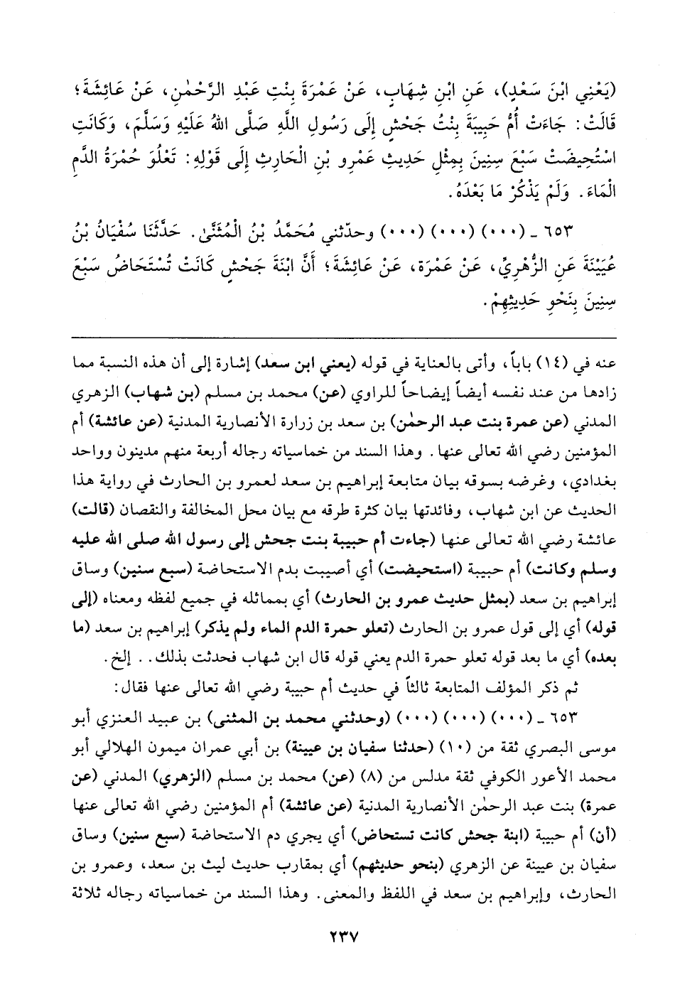 ٦٥٣ - (٠٠) (٠٠) (٠٠) (وحدثني محمد بن المثنى) بن عبيد العنزي أبو موسى البصري ثقة من (١٠) (حدثنا سفيان بن عيينة) بن أبي عمران ميمون الهلالي أبو محمد الأعور الكوفي ثقة مدلس من (٨) (عن) محمد بن مسلم (الزهري) المدني (عن عمرة) بنت عبد الرحمن الأنصارية المدنية (عن عائشة) أم المؤمنين رضي الله تعالى عنها (أن) أم حبيبة (ابنة جحش كانت نستحاض) أي يجري دم الاستحاضة (سبع سنين) وساق سفيان بن عيينة عن الزهري (بنحو حديثهم) أي بمقارب حديث ليث بن سعد، وعمرو بن الحارث، وإبراهيم بن سعد في اللفظ والمعنى. وهذا السند من خماسياته رجاله ثلاثة