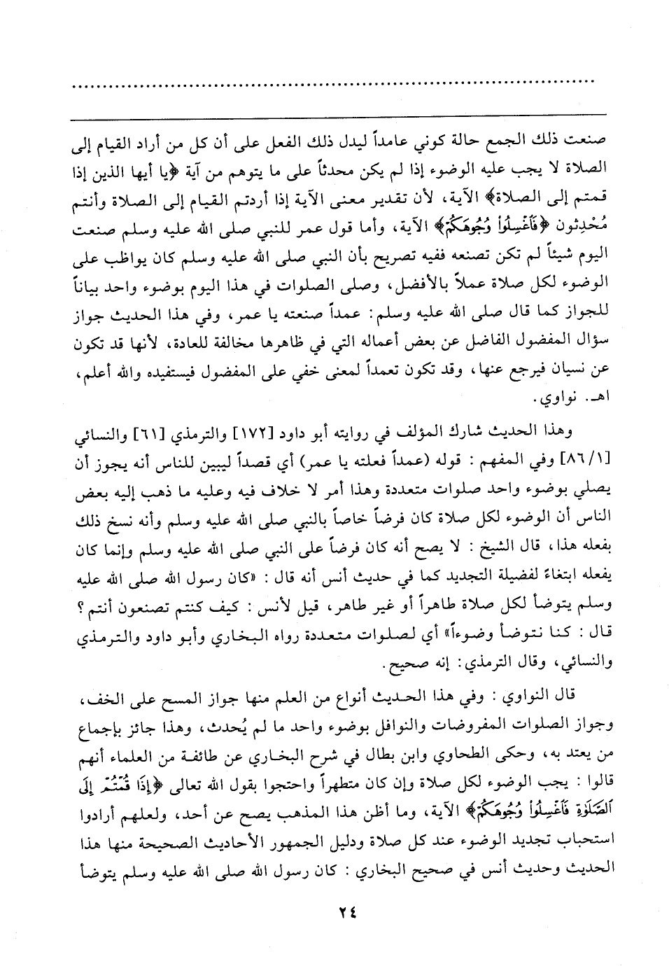 وهذا الحديث شارك المؤلف في روايته أبو داود [١٧٢] والترمذي [٦١] والنسائي [١/ ٨٦] وفي المفهم: قوله (عمدًا فعلته يا عمر) أي قصدًا ليبين للناس أنه يجوز أن يصلي بوضوء واحد صلوات متعددة وهذا أمر لا خلاف فيه وعليه ما ذهب إليه بعض الناس أن الوضوء لكل صلاة كان فرضًا خاصًّا بالنبي صلى الله عليه وسلم وأنه نسخ ذلك بفعله هذا، قال الشيخ: لا يصح أنه كان فرضًا على النبي صلى الله عليه وسلم وإنما كان يفعله ابتغاءً لفضيلة التجديد كما في حديث أنس أنه قال: "كان رسول الله صلى الله عليه وسلم يتوضأ لكل صلاة طاهرًا أو غير طاهر، قيل لأنس: كيف كنتم تصنعون أنتم؟ قال: كنا نتوضأ وضوءًا" أي لصلوات متعددة رواه البخاري وأبو داود والترمذي والنسائي، وقال الترمذي: إنه صحيح.