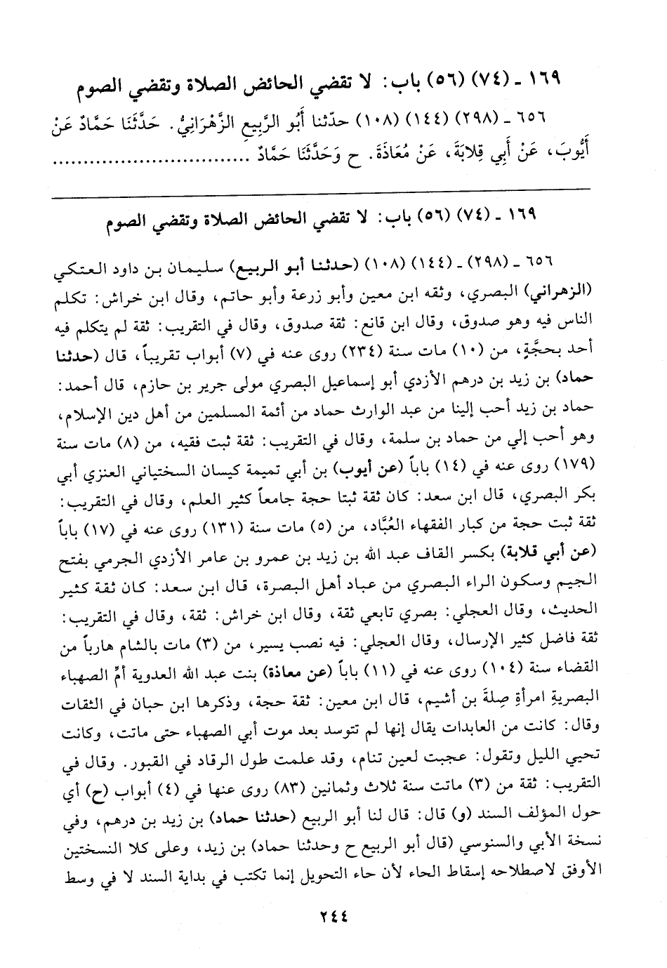 ٦٥٦ - (٢٩٨) (١٤٤) (١٠٨) حدَّثنا أَبُو الرَّبِيعِ الزَّهْرَانِيُّ. حَدَّثَنَا حَمادٌ عَنْ أَيُّوبَ، عَنْ أَبِي قِلابَةَ، عَنْ مُعَاذَةَ. ح وَحَدَّثَنَا حَمَّادٌ