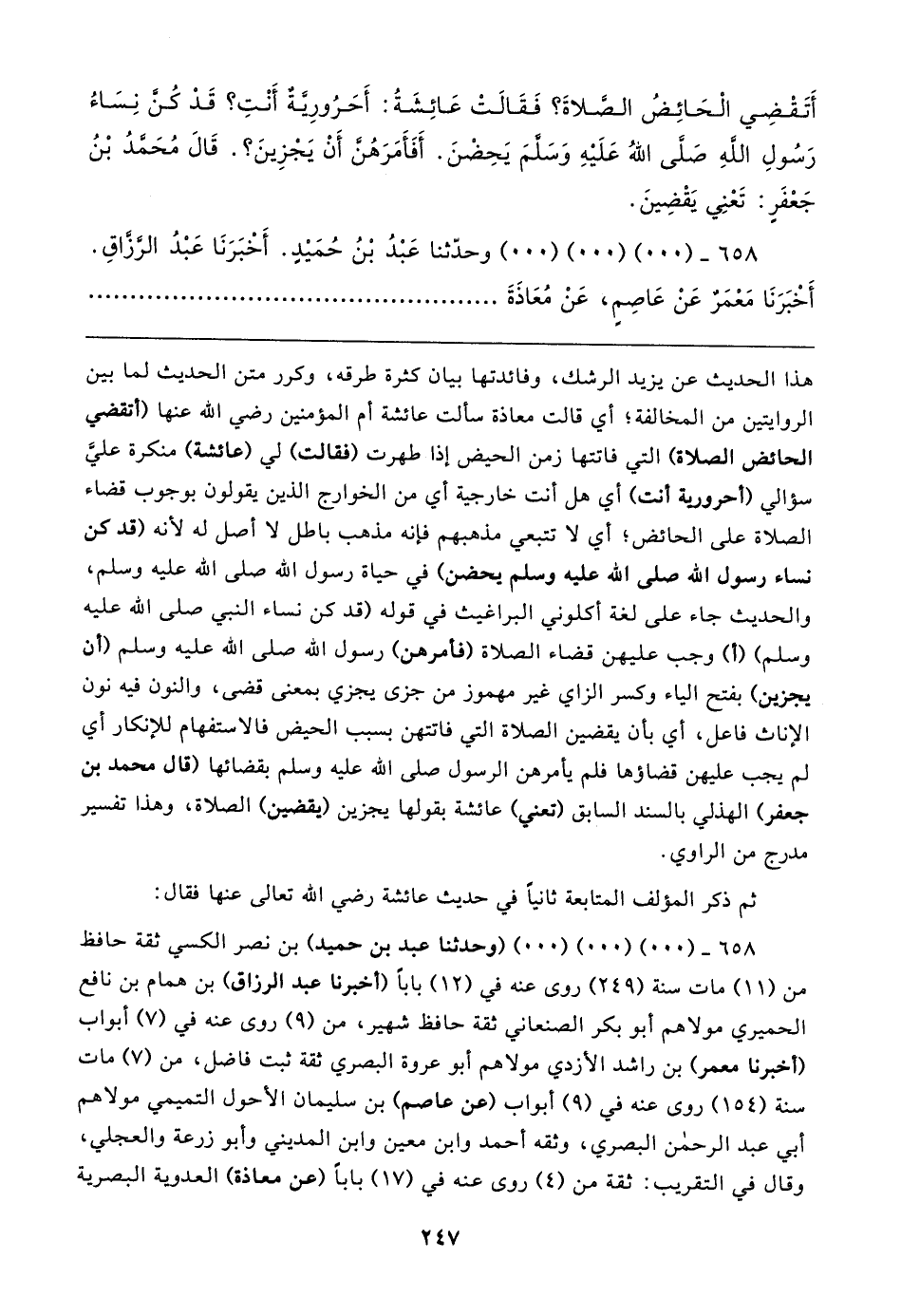 هذا الحديث عن يزيد الرشك، وفائدتها بيان كثرة طرقه، وكرر متن الحديث لما بين الروايتين من المخالفة؛ أي قالت معاذة سألت عائشة أم المؤمنين رضي الله عنها (أتقضي الحائض الصلاة) التي فاتتها زمن الحيض إذا طهرت (فقالت) لي (عائشة) منكرة عليَّ سؤالي (أحرورية أنت) أي هل أنت خارجية أي من الخوارج الذين يقولون بوجوب قضاء الصلاة على الحائض؛ أي لا تتبعي مذهبهم فإنه مذهب باطل لا أصل له لأنه (قد كن نساء رسول الله صلى الله عليه وسلم يحضن) في حياة رسول الله صلى الله عليه وسلم، والحديث جاء على لغة أكلوني البراغيث في قوله (قد كن نساء النبي صلى الله عليه وسلم) (أ) وجب عليهن قضاء الصلاة (فأمرهن) رسول الله صلى الله عليه وسلم (أن يجزين) بفتح الياء وكسر الزاي غير مهموز من جزى يجزي بمعنى قضى، والنون فيه نون الإناث فاعل، أي بأن يقضين الصلاة التي فاتتهن بسبب الحيض فالاستفهام للإنكار أي لم يجب عليهن قضاؤها فلم يأمرهن الرسول صلى الله عليه وسلم بقضائها (قال محمد بن جعفر) الهذلي بالسند السابق (تعني) عائشة بقولها يجزين (يقضين) الصلاة، وهذا تفسير مدرج من الراوي.