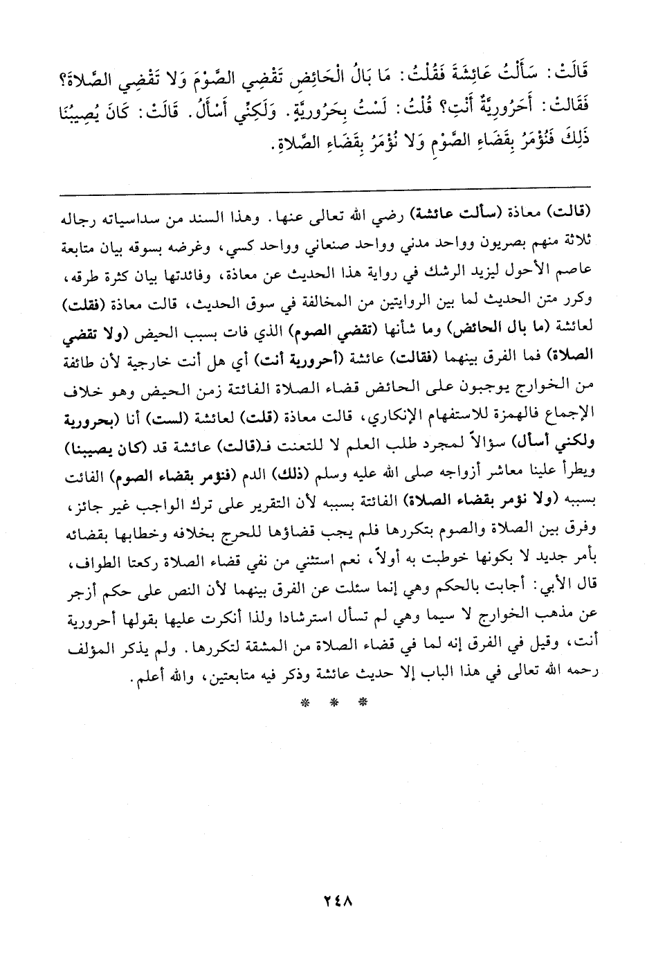 قَالتْ: سَأَلْتُ عَائِشَةَ فَقُلْتُ: مَا بَالُ الْحَائِضِ تَقْضِي الصَّوْمَ وَلا تَقْضِي الصَّلاةَ؟ فَقَالتْ: أَحَرُورِيَّةٌ أَنْتِ؟ قُلْتُ: لَسْتُ بِحَرُوريَّةٍ. وَلَكِني أَسْأَلُ. قَالتْ: كَانَ يُصِيبُنَا ذَلِكَ فَنُؤْمَرُ بِقَضَاءِ الصَّوْمِ وَلا نُؤْمَرُ بِقَضَاءِ الصَّلاةِ