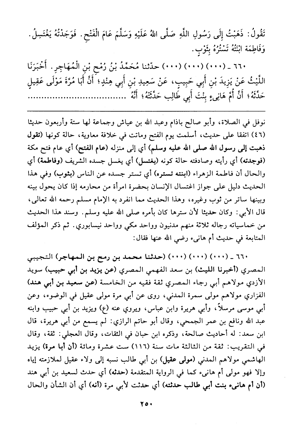 ٦٦٠ - (٠٠) (٠٠) (٠٠) حدَّثنا مُحَمَّدُ بْنُ رُمْحِ بْنِ الْمُهَاجِرِ. أَخْبَرَنَا اللَّيثُ عَنْ يَزِيدَ بْنِ أَبِي حَبِيبٍ، عَنْ سَعِيدِ بْنِ أَبِي هِنْدٍ؛ أَن أَبَا مُرَّةَ مَوْلَى عَقِيلٍ حَدَّثَهُ؛ أَنَّ أُمَّ هَانِئٍ بِنْتَ أَبِي طَالِب حَدَّثَتْهُ؛ أَنَّهُ