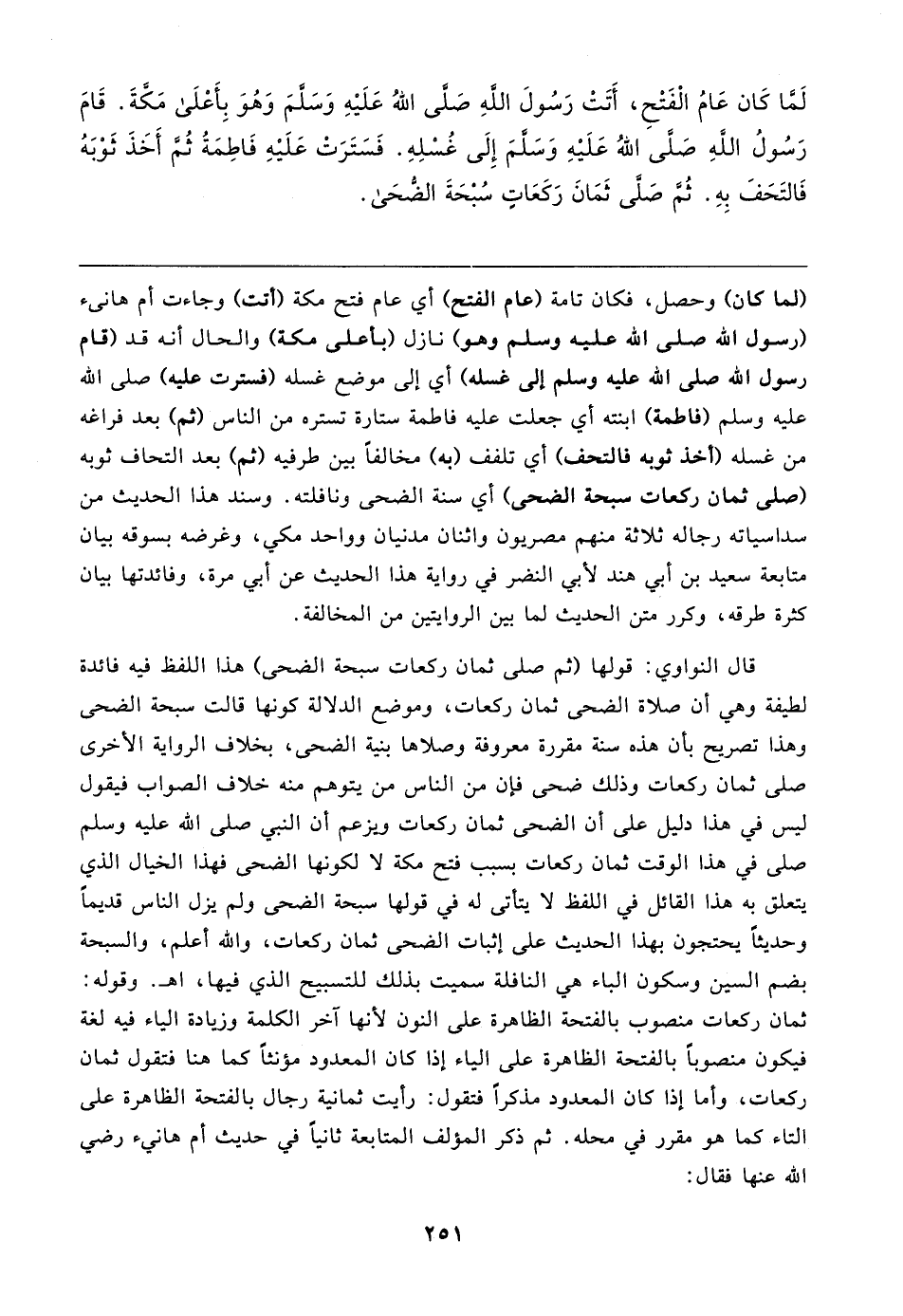 قال النواوي: قولها (ثم صلى ثمان ركعات سبحة الضحى) هذا اللفظ فيه فائدة لطيفة وهي أن صلاة الضحى ثمان ركعات، وموضع الدلالة كونها قالت سبحة الضحى وهذا تصريح بأن هذه سنة مقررة معروفة وصلاها بنية الضحى، بخلاف الرواية الأخرى صلى ثمان ركعات وذلك ضحى فإن من الناس من يتوهم منه خلاف الصواب فيقول ليس في هذا دليل على أن الضحى ثمان ركعات ويزعم أن النبي صلى الله عليه وسلم صلى في هذا الوقت ثمان ركعات بسبب فتح مكة لا لكونها الضحى فهذا الخيال الذي يتعلق به هذا القائل في اللفظ لا يتأتى له في قولها سبحة الضحى ولم يزل الناس قديمًا وحديثًا يحتجون بهذا الحديث على إثبات الضحى ثمان ركعات، والله أعلم، والسبحة بضم السين وسكون الباء هي النافلة سميت بذلك للتسبيح الذي فيها، اهـ. وقوله: ثمان ركعات منصوب بالفتحة الظاهرة على النون لأنها آخر الكلمة وزيادة الياء فيه لغة فيكون منصوبًا بالفتحة الظاهرة على الياء إذا كان المعدود مؤنثًا كما هنا فتقول ثمان ركعات، وأما إذا كان المعدود مذكرًا فتقول: رأيت ثمانية رجال بالفتحة الظاهرة على التاء كما هو مقرر في محله. ثم ذكر المؤلف المتابعة ثانيًا في حديث أم هانيء رضي الله عنها فقال:
