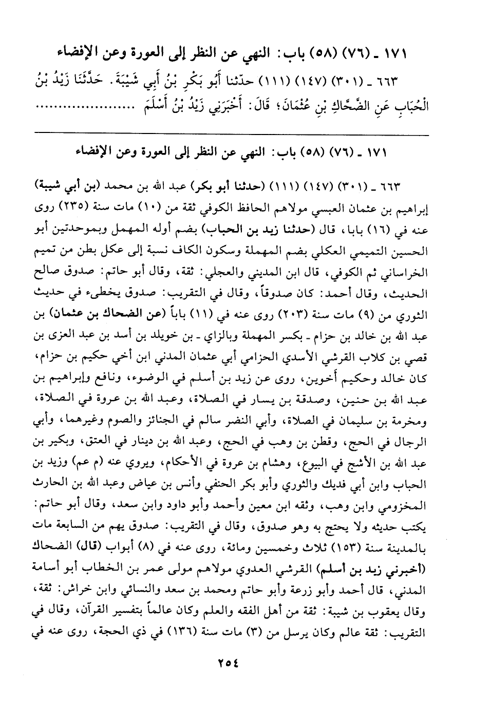 ٦٦٣ - (٣٠١) (١٤٧) (١١١) حدَّثنا أَبُو بَكْرِ بْنُ أَبِي شَيبَةَ. حَدَّثَنَا زيدُ بْنُ الْحُبَابِ عَنِ الضَّحَّاكِ بْنِ عُثْمَانَ؛ قَال: أَخْبَرَنِي زَيدُ بْنُ أَسْلَمَ