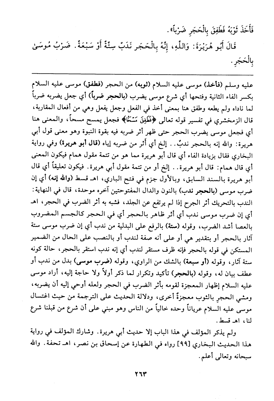 قَال أَبُو هُرَيرَةَ: وَاللهِ، إِنَّهُ بِالْحَجَر نَدَبٌ سِتةٌ أَوْ سَبْعَةٌ. ضَرْبُ مُوسَى بِالْحَجَرِ
