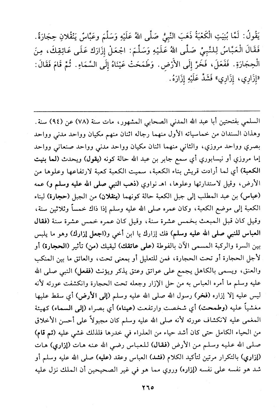 يَقُولُ: لَمَّا بُنِيَتِ الْكَعْبَةُ ذَهَبَ النَّبِيُّ صَلَّى اللهُ عَلَيهِ وَسَلَّمَ وعَبَّاسٌ يَنْقُلانِ حِجَارَةً. فَقَال الْعَبَّاسُ لِلنَّبِيِّ صَلَّى اللهُ عَلَيهِ وَسَلَّمَ: اجْعَلْ إِزَارَك عَلَى عَاتِقِكَ، مِنَ الْحِجَارَةِ. فَفَعَلَ، فَخَرَّ إِلَى الأَرْضِ. وَطَمَحَتْ عَينَاهُ إِلَى السَّمَاءِ. ثُمَّ قَامَ فَقَال: "إِزَارِي، إِزَارِي" فَشَدَّ عَلَيهِ إِزَارَهُ