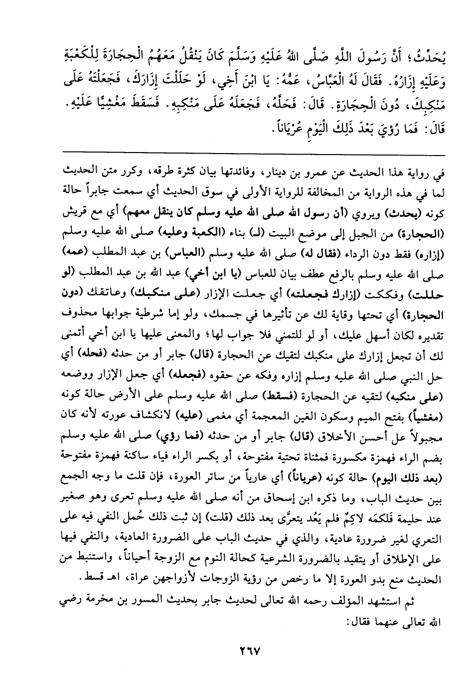 يُحَدِّثُ؛ أَنَّ رَسُولَ اللهِ صَلَّى اللهُ عَلَيهِ وَسَلَّمَ كَانَ يَنْقُلُ مَعَهُمُ الْحِجَارَةَ لِلْكَعْبَةِ وَعَلَيهِ إِزَارُهُ. فَقَال لَهُ الْعَبَّاسُ، عَمُّهُ: يَا ابْنَ أَخِي، لَوْ حَلَلْتَ إِزَارَكَ، فَجَعَلْتَهُ عَلَى مَنْكِبِكَ، دُونَ الْحِجَارَةِ. قَال: فَحَلَّهُ، فَجَعَلَهُ عَلَى مَنْكِبِهِ. فَسَقَطَ مَغْشِيًّا عَلَيهِ. قَال: فَمَا رُؤيَ بَعْدَ ذَلِكَ الْيَوْمِ عُرْيَانًا