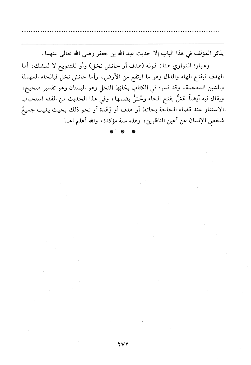 وعبارة النواوي هنا: قوله (هدف أو حائش نخل) وأو للتنويع لا للشك، أما الهدف فبفتح الهاء والدال وهو ما ارتفع من الأرض، وأما حائش نخل فبالحاء المهملة والشين المعجمة، وقد فسره في الكتاب بحَائِطِ النخلِ وهو البستان وهو تفسير صحيح، ويقال فيه أيضًا حَشٌّ بفتح الحاء وحُشٌّ بضمها، وفي هذا الحديث من الفقه استحباب الاستتار عند قضاء الحاجة بحائط أو هدف أو وَهْدة أو نحو ذلك بحيث يغيب جميعُ شخصِ الإنسان عن أعين الناظرين، وهذه سنة مؤكدة، والله أعلم اهـ.