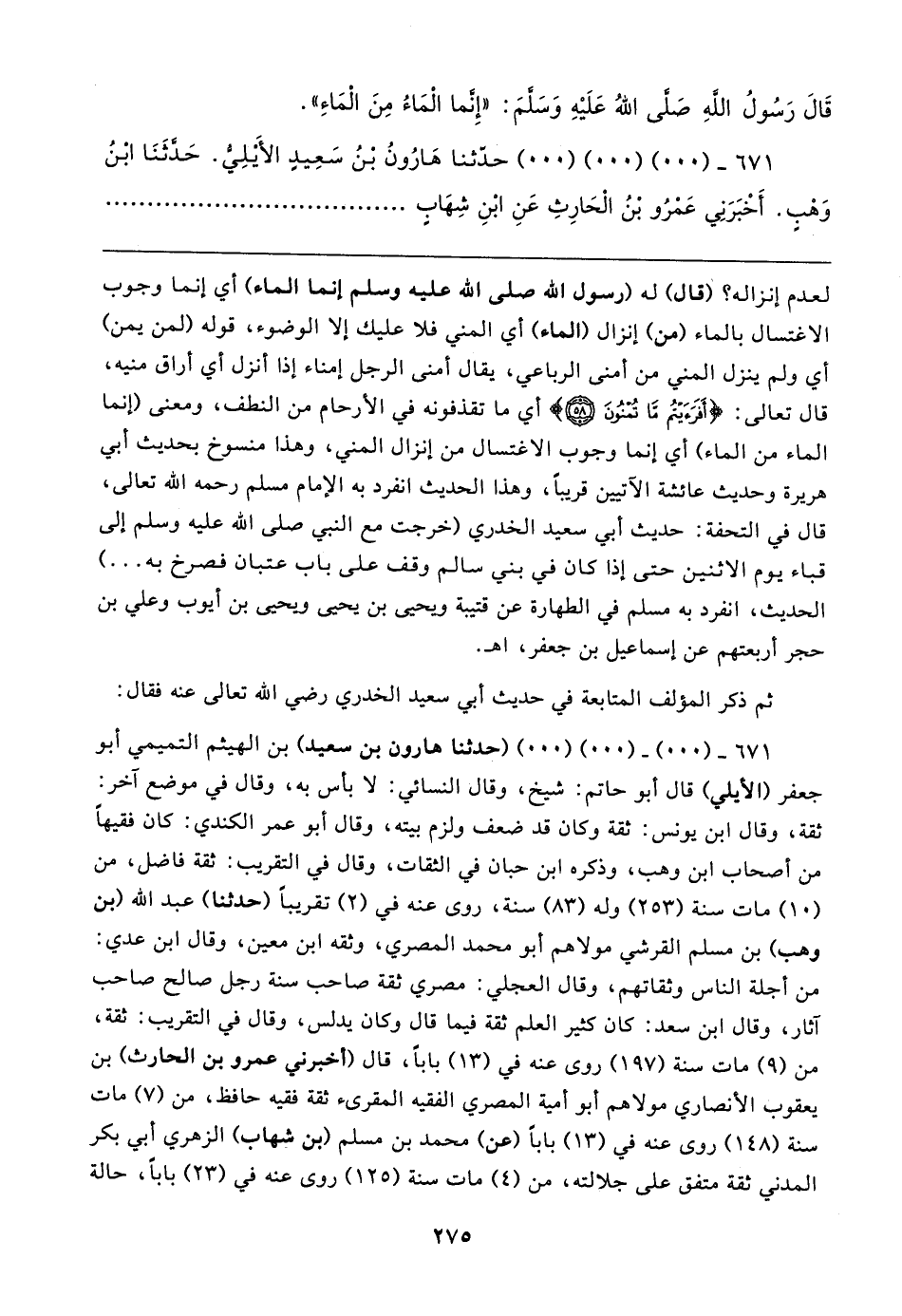 ٦٧١ - (٠٠) (٠٠) (٠٠) (حدثنا هارون بن سعيد) بن الهيثم التميمي أبو جعفر (الأيلي) قال أبو حاتم: شيخ، وقال النسائي: لا بأس به، وقال في موضع آخر: ثقة، وقال ابن يونس: ثقة وكان قد ضعف ولزم بيته، وقال أبو عمر الكندي: كان فقيهًا من أصحاب ابن وهب، وذكره ابن حبان في الثقات، وقال في التقريب: ثقة فاضل، من (١٠) مات سنة (٢٥٣) وله (٨٣) سنة، روى عنه في (٢) تقريبًا (حدثنا) عبد الله (بن وهب) بن مسلم القرشي مولاهم أبو محمد المصري، وثقه ابن معين، وقال ابن عدي: من أجلة الناس وثقاتهم، وقال العجلي: مصري ثقة صاحب سنة رجل صالح صاحب آثار، وقال ابن سعد: كان كثير العلم ثقة فيما قال وكان يدلس، وقال في التقريب: ثقة، من (٩) مات سنة (١٩٧) روى عنه في (١٣) بابا، قال (أخبرني عمرو بن الحارث) بن يعقوب الأنصاري مولاهم أبو أمية المصري الفقيه المقرئ ثقة فقيه حافظ، من (٧) مات سنة (١٤٨) روى عنه في (١٣) بابا (عن) محمد بن مسلم (بن شهاب) الزهري أبي بكر المدني ثقة متفق على جلالته، من (٤) مات سنة (١٢٥) روى عنه في (٢٣) بابا، حالة
