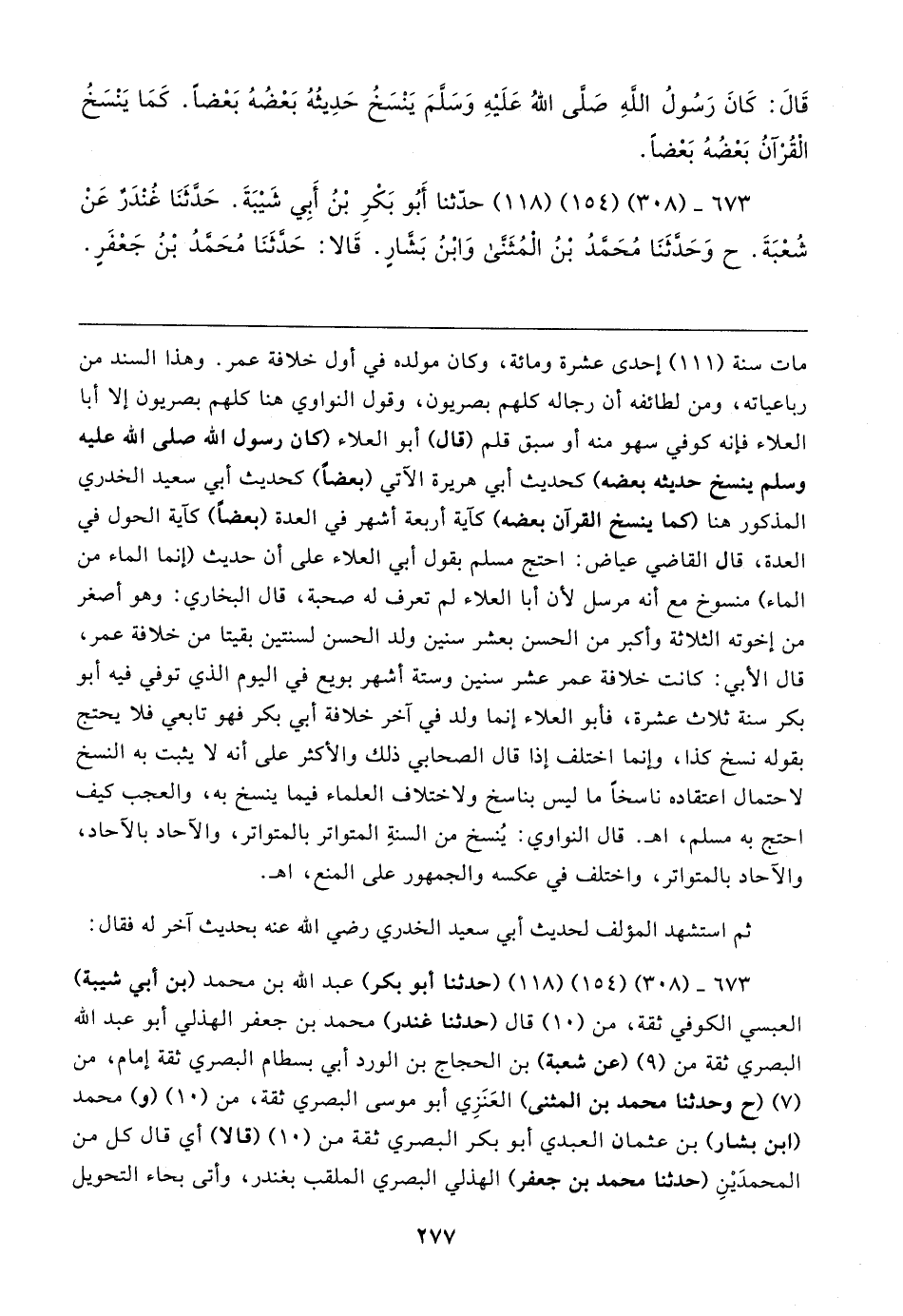مات سنة (١١١) إحدى عشرة ومائة، وكان مولده في أول خلافة عمر. وهذا السند من رباعياته، ومن لطائفه أن رجاله كلهم بصريون، وقول النواوي هنا كلهم بصريون إلا أبا العلاء فإنه كوفي سهو منه أو سبق قلم (قال) أبو العلاء (كان رسول الله صلى الله عليه وسلم ينسخ حديثه بعضه) كحديث أبي هريرة الآتي (بعضًا) كحديث أبي سعيد الخدري المذكور هنا (كما ينسخ القرآن بعضه) كآية أربعة أشهر في العدة (بعضًا) كآية الحول في العدة، قال القاضي عياض: احتج مسلم بقول أبي العلاء على أن حديث (إنما الماء من الماء) منسوخ مع أنه مرسل لأن ابا العلاء لم تعرف له صحبة، قال البخاري: وهو أصغر من إخوته الثلاثة وأكبر من الحسن بعشر سنين ولد الحسن لسنتين بقيتا من خلافة عمر، قال الأبي: كانت خلافة عمر عشر سنين وستة أشهر بويع في اليوم الذي توفي فيه أبو بكر سنة ثلاث عشرة، فأبو العلاء إنما ولد في آخر خلافة أبي بكر فهو تابعي فلا يحتج بقوله نسخ كذا، وإنما اختلف إذا قال الصحابي ذلك والأكثر على أنه لا يثبت به النسخ لاحتمال اعتقاده ناسخًا ما ليس بناسخ ولاختلاف العلماء فيما ينسخ به، والعجب كيف احتج به مسلم، اهـ. قال النواوي: يُنسخ من السنةِ المتواتر بالمتواتر، والآحاد بالآحاد، والآحاد بالمتواتر، واختلف في عكسه والجمهور على المنع، اهـ.