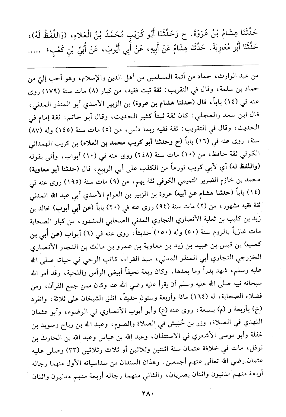 من عبد الوارث، حماد من أئمة المسلمين من أهل الدين والإسلام، وهو أحب إليّ من حماد بن سلمة، وقال في التقريب: ثقة ثبت فقيه، من كبار (٨) مات سنة (١٧٩) روى عنه في (١٤) بابا، قال (حدثنا هشام بن عروة) بن الزبير الأسدي أبو المنذر المدني، قال ابن سعد والعجلي: كان ثقة ثبتًا كثير الحديث، وقال أبو حاتم: ثقة إمام في الحديث، وقال في التقريب: ثقة فقيه ربما دلس، من (٥) مات سنة (١٤٥) وله (٨٧) سنة، روى عنه في (١٦) بابا (ح وحدثنا أبو كريب محمد بن العلاء) بن كريب الهمداني الكوفي ثقة حافظ، من (١٥) مات سنة (٢٤٨) روى عنه في (١٠) أبواب، وأتى بقوله (واللفظ له) أي لأبي كريب تورعًا من الكذب على أبي الربيع، قال (حدثنا أبو معاوية) محمد بن خازم الضرير التميمي الكوفي ثقة يهم، من (٩) مات سنة (١٩٥) روى عنه في (١٤) بابا (حدثنا هشام عن أبيه) عروة بن الزبير بن العوام الأسدي أبي عبد الله المدني ثقة فقيه مشهور، من (٢) مات سنة (٩٤) روى عنه في (٢٠) بابا (عن أبي أيوب) خالد بن زيد بن كليب بن ثعلبة الأنصاري النجاري المدني الصحابي المشهور، من كبار الصحابة مات غازيا بالروم سنة (٥٠) وله (١٥٠) حديثًا، روى عنه في (٦) أبواب (عن أُبي بن كعب) بن قيس بن عبيد بن زيد بن معاوية بن عمرو بن مالك بن النجار الأنصاري الخزرجي النجاري أبي المنذر المدني، سيد القراء، كاتب الوحي في حياته صلى الله عليه وسلم، شهد بدرًا وما بعدها، وكان ربعة نحيفًاأبيض الرأس واللحية، وقد أمر الله سبحانه نبيه صلى الله عليه وسلم أن يقرأ عليه رضي الله عنه وكان ممن جمع القرآن، ومن فضلاء الصحابة، له (١٦٤) مائة وأربعة وستون حديثًا، اتفق الشيخان على ثلاثة، وانفرد (خ) بأربعة و (م) بسبعة، روى عنه (ع) وأبو أيوب الأنصاري في الوضوء، وأبو عثمان النهدي في الصلاة، وزر بن حُبيش في الصلاة والصوم، وعبد الله بن رباح وسويد بن غفلة وأبو موسى الأشعري في الاستئذان، وعبد الله بن عباس وعبد الله بن الحارث بن نوفل، مات في خلافة عثمان سنة اثنتين وثلاثين أو ثلاث وثلاثين (٣٣) وصلى عليه عثمان رضي الله تعالى عنهم أجمعين. وهذان السندان من سداسياته الأول منهما رجاله أربعة منهم مدنيون واثنان بصريان، والثاني منهما رجاله أربعة منهم مدنيون واثنان