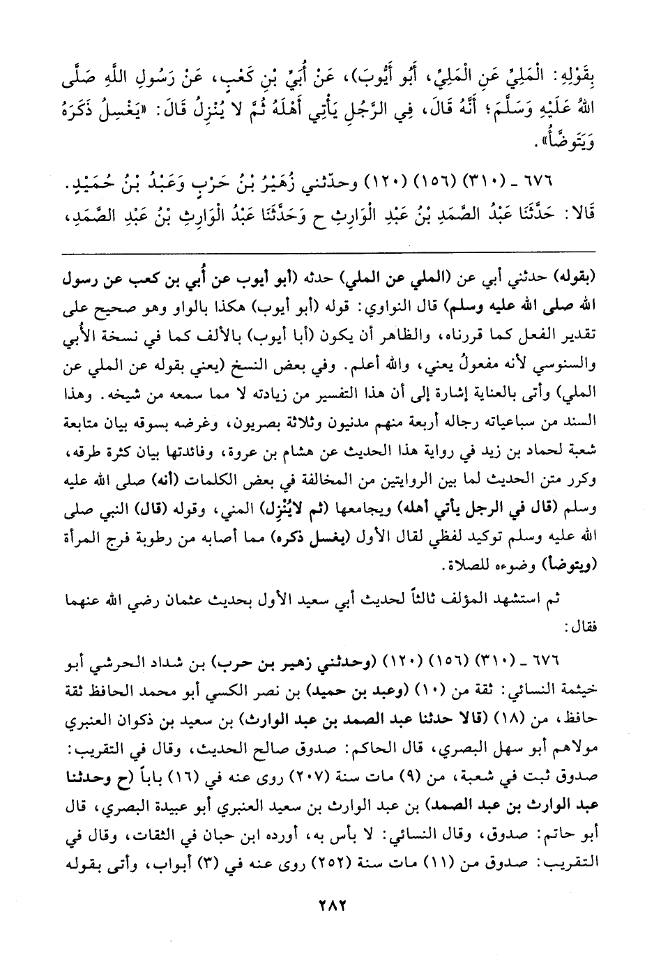 بِقَوْلِهِ: الْمَلِيِّ عَنِ الْمَلِيِّ، أَبُو أَيُّوبَ)، عَنْ أُبَي بْنِ كَعْبِ، عَن رَسُولِ اللهِ صَلَّى اللهُ عَلَيهِ وَسَلَّمَ؛ أَنَّهُ قَال، فِي الرَّجُلِ يَأْتِي أَهْلَهُ ثُمَّ لا يُنْزِلُ قَال: "يَغْسِلُ ذَكَرَهُ وَيَتَوضَّأُ".