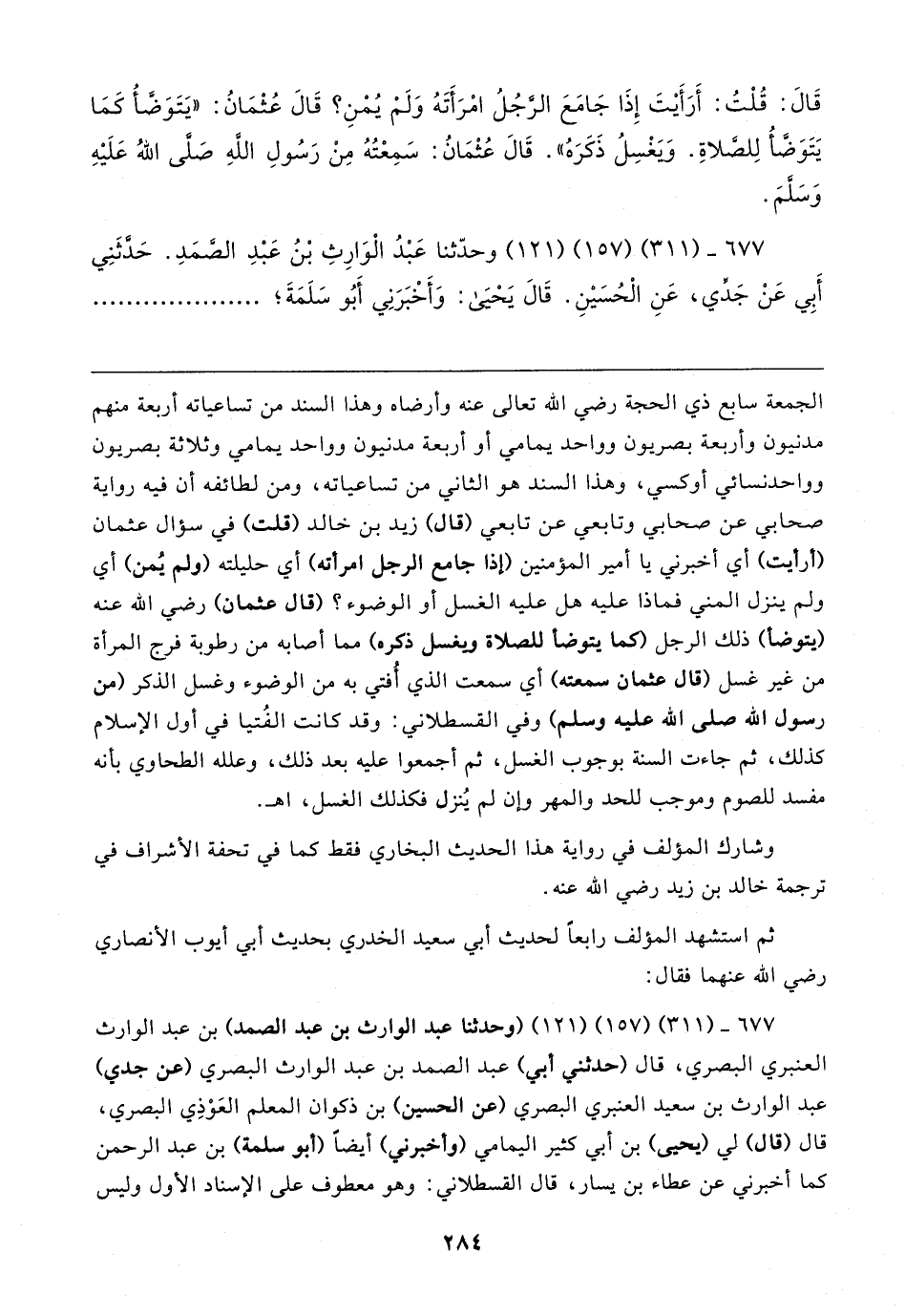 الجمعة سابع ذي الحجة رضي الله تعالى عنه وأرضاه وهذا السند من تساعياته أربعة منهم مدنيون وأربعة بصريون وواحد يمامي أو أربعة مدنيون وواحد يمامي وثلاثة بصريون وواحد نسائي أوكسي، وهذا السند هو الثاني من تساعياته، ومن لطائفه أن فيه رواية صحابي عن صحابي وتابعي عن تابعي (قال) زيد بن خالد (قلت) في سؤال عثمان (أرأيت) أي أخبرني يا أمير المؤمنين (إذا جامع الرجل امرأته) أي حليلته (ولم يُمن) أي ولم ينزل المني فماذا عليه هل عليه الغسل أو الوضوء؟ (قال عثمان) رضي الله عنه (يتوضأ) ذلك الرجل (كما يتوضأ للصلاة ويغسل ذكره) مما أصابه من رطوبة فرج المرأة من غير غسل (قال عثمان سمعته) أي سمعت الذي أُفتي به من الوضوء وغسل الذكر (من رسول الله صلى الله عليه وسلم) وفي القسطلاني: وقد كانت الفُتيا في أول الإسلام كذلك، ثم جاءت السنة بوجوب الغسل، ثم أجمعوا عليه بعد ذلك، وعلله الطحاوي بأنه مفسد للصوم وموجب للحد والمهر وإن لم يُنزل فكذلك الغسل، اهـ.