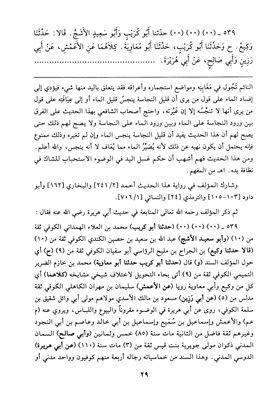 ٥٣٩ - (٠٠) (٠٠) (٠٠) (حدثنا أبو كريب) محمد بن العلاء الهمداني الكوفي ثقة من (١٠) (وأبو سعيد الأشج) عبد الله بن سعيد بن حصين الكندي الكوفي ثقة من (١٠) (قالا حدثنا وكيع) بن الجراح بن مليح الرؤاسي أبو سفيان الكوفي ثقة من (٩) (ح) أي حول المؤلف السند (و) قال (حدثنا أبو كريب حدثنا أبو معاوية) محمد بن خازم الضرير التميمي الكوفي ثقة من (٩) أتى بحاء التحويل لاختلاف شيخي مشايخه (كلاهما) أي كل من وكيع وأبي معاوية رويا (عن الأعمش) سليمان بن مهران الكاهلي الكوفي ثقة مدلس من (٥) (عن أبي رَزِين) مسعود بن مالك الأسدي مولاهم مولى أبي وائل شقيق بن سلمة الكوفي، روى عن أبي هريرة في الوضوء مقرونًا والبيوع واللباس، ويروي عنه (م عم) والأعمش وإسماعيل بن سُمَيع واسماعيل بن أبي خالد وعاصم بن أبي النجود وغيرهم ثقة فاضل من الثانية مات سنة (٨٥) خمس وثمانين (وأبي صالح) السمان المدني ذكوان مولى جويرية بنت قيس ثقة من (٣) مات سنة (١١٠) (عن أبي هريرة) الدوسي المدني. وهذا السند من خماسياته رجاله أربعة منهم كوفيون وواحد مدني أو