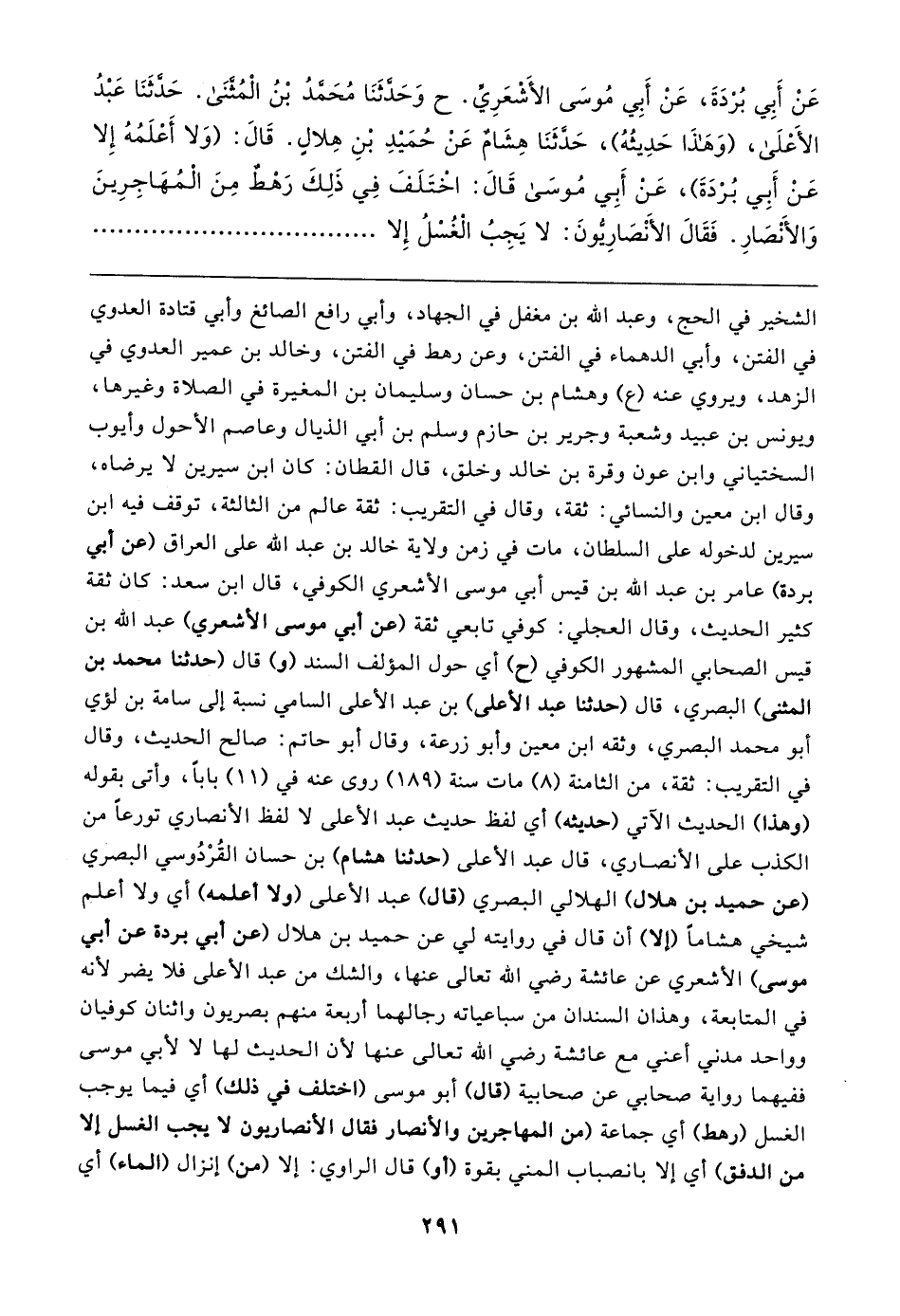 عَنْ أَبِي بُرْدَةَ، عَنْ أَبِي مُوسَى الأَشْعَرِيّ. ح وَحَدَّثَنَا مُحَمَّدُ بْنُ الْمُثَّنَى. حَدَّثَنَا عَبْدُ الأَعْلَى، (وَهَذَا حَدِيثُهُ)، حَدَّثَنَا هِشَامٌ عَنْ حُمَيدِ بْنِ هِلالٍ. قَال: (وَلا أَعْلَمُهُ إِلا عَنْ أَبِي بُرْدَةَ)، عَنْ أَبِي مُوسَى قَال: اخْتَلَفَ فِي ذَلِكَ رَهْطْ مِنَ الْمُهَاجِرِينَ وَالأَنْصَارِ. فَقَال الأَنْصَارِيُّونَ: لا يَجِبُ الْغُسْلُ إِلا