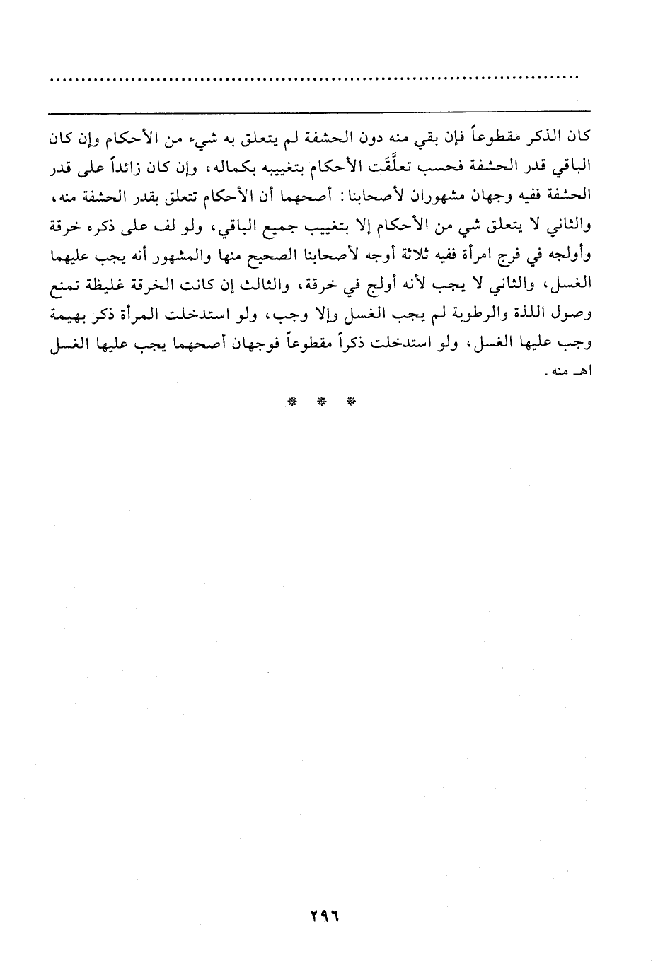 كان الذكر مقطوعًا فإن بقي منه دون الحشفة لم يتعلق به شيء من الأحكام وإن كان الباقي قدر الحشفة فحسب تعلَّقَت الأحكام بتغييبه بكماله، وإن كان زائدًا على قدر الحشفة ففيه وجهان مشهوران لأصحابنا: أصحهما أن الأحكام تتعلق بقدر الحشفة منه، والثاني لا يتعلق شيء من الأحكام إلا بتغييب جميع الباقي، ولو لف على ذكره خرقة وأولجه في فرج امرأة ففيه ثلاثة أوجه لأصحابنا الصحيح منها والمشهور أنه يجب عليهما الغسل، والثاني لا يجب لأنه أولج في خرقة، والثالث إن كانت الخرقة غليظة تمنع وصول اللذة والرطوبة لم يجب الغسل وإلا وجب، ولو استدخلت المرأة ذكر بهيمة وجب عليها الغسل، ولو استدخلت ذكرًا مقطوعًا فوجهان أصحهما يجب عليها الغسل اهـ منه.