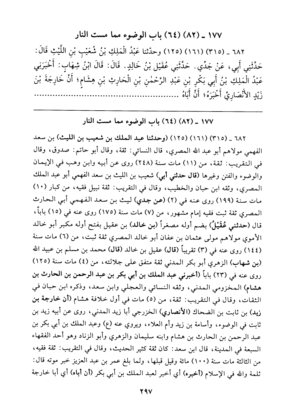 ٦٨٢ - (٣١٥) (١٦١) (١٢٥) (وحدثنا عبد الملك بن شعيب بن الليث) بن سعد الفهمي مولاهم أبو عبد الله المصري، قال النسائي: ثقة، وقال أبو حاتم: صدوق، وقال في التقريب: ثقة، من (١١) مات سنة (٢٤٨) روى عن أبيه وابن وهب في الإيمان والوضوء والفتن وغيرها (قال حدثني أبي) شعيب بن الليث بن سعد الفهمي أبو عبد الملك المصري، وثقه ابن حبان والخطيب، وقال في التقريب: ثقة نبيل فقيه، من كبار (١٥) مات سنة (١٩٩) روى عنه في (٢) (عن جدي) ليث بن سعد الفهمي أبي الحارث المصري ثقة ثبت فقيه إمام مشهور، من (٧) مات سنة (١٧٥) روى عنه في (١٥) بابا، قال (حدثني عُقَيل) بضم أوله مصغرًا (بن خالد) بن عقيل بفتح أوله مكبر أبو خالد الأموي مولاهم مولى عثمان بن عفان أبو خالد المصري ثقة ثبت، من (٦) مات سنة (١٤٤) روى عنه في (٣) تقريبًا (قال) عقيل بن خالد (قال) محمد بن مسلم بن عبيد الله (بن شهاب) الزهري أبو بكر المدني ثقة متفق على جلالته، من (٤) مات سنة (١٢٥) روى عنه في (٢٣) بابا (أخبرني عبد الملك بن أبي بكر بن عبد الرحمن بن الحارث بن هشام) المخزومي المدني، وثقه النسائي والعجلي وابن سعد، وذكره ابن حبان في الثقات، وقال في التقريب: ثقة، من (٥) مات في أول خلافة هشام (أن خارجة بن زيد) بن ثابت بن الضحاك (الأنصاري) الخزرجي أبا زيد المدني، روى عن أبيه زيد بن ثابت في الوضوء، وأسامة بن زيد وأم العلاء، ويروي عنه (ع) وعبد الملك بن أبي بكر بن عبد الرحمن بن الحارث بن هشام وابنه سليمان والزهري وأبو الزناد وهو أحد الفقهاء السبعة في المدينة، قال ابن سعد: كان ثقة كثير الحديث، وقال في التقريب: ثقة فقيه، من الثالثة مات سنة (١٠٠) مائة وقيل قبلها، ولما بلغ عمر بن عبد العزيز خبر موته قال: ثلمة والله في الإسلام (أخبره) أي أخبر لعبد الملك بن أبي بكر (أن أباه) أي أبا خارجة
