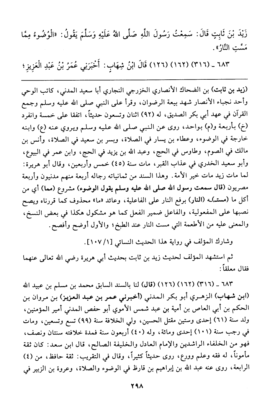 (زيد بن ثابت) بن الضحاك الأنصاري الخزرجي النجاري أبا سعيد المدني، كاتب الوحي وأحد نجباء الأنصار شهد بيعة الرضوان، وقرأ على النبي صلى الله عليه وسلم وجمع القرآن في عهد أبي بكر الصديق، له (٩٢) اثنان وتسعون حديثًا، اتفقا على خمسة وانفرد (خ) بأربعة و (م) بواحد، روى عن النبي صلى الله عليه وسلم ويروي عنه (ع) وابنه خارجة في الوضوء، وعطاء بن يسار في الصلاة، وبسر بن سعيد في الصلاة، وأنس بن مالك في الصوم، وطاوس في الحج، وعبد الله بن يزيد في الحج، وابن عمر في البيوع، وأبو سعيد الخدري في عذاب القبر، مات سنة (٤٥) خمس وأربعين، وقال أبو هريرة: لما مات زيد مات خير الأمة. وهذا السند من ثمانياته رجاله أربعة منهم مدنيون وأربعة مصريون (قال سمعت رسول الله صلى الله عليه وسلم يقول الوضوء) مشروع (مما) أي من أكل ما (مست) ـه (النار) برفع النار على الفاعلية، وعائد ما" محذوف كما قررناه ويصح نصبها على المفعولية، والفاعل ضمير الفعل كما هو مشكول هكذا في بعض النسخ، والمعنى عليه من الأطعمة التي مست النار عند الطبخ؛ والأول أوضح وأفصح.