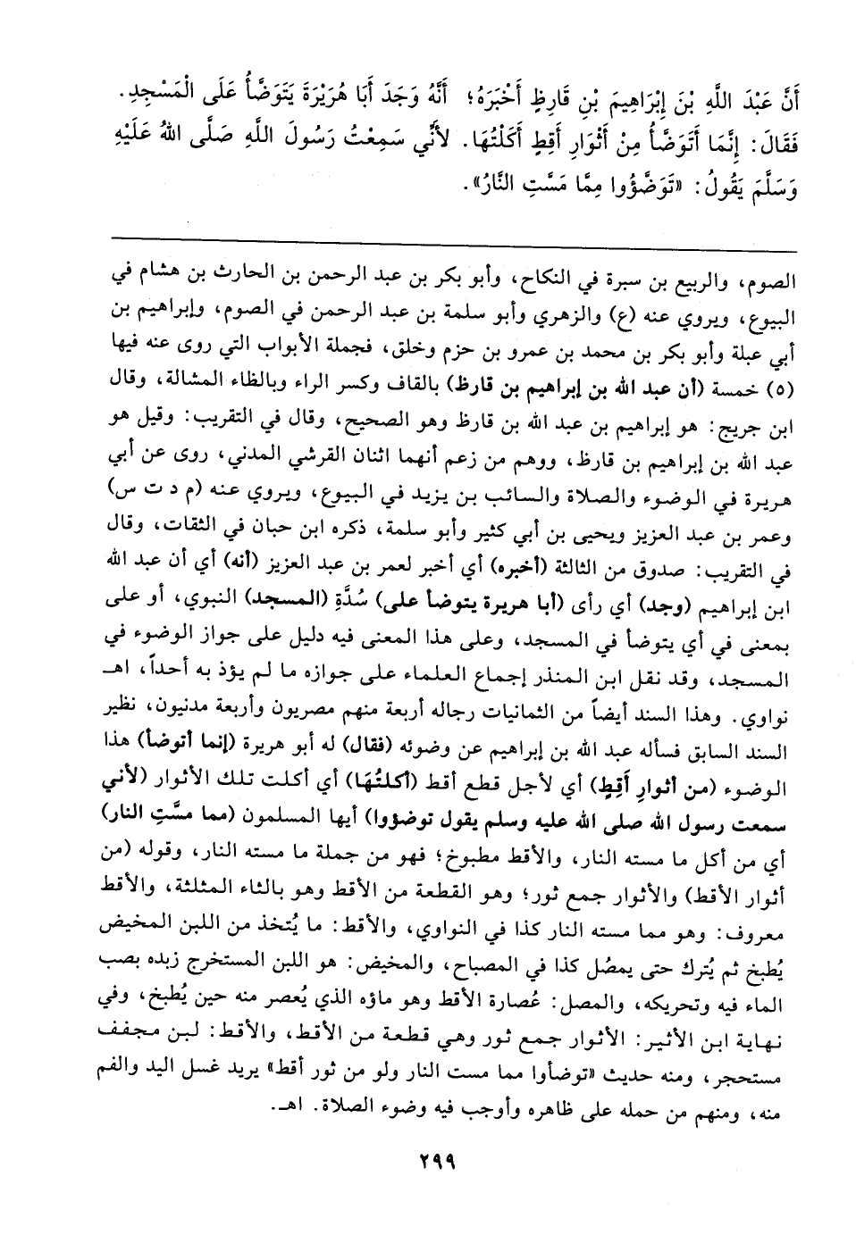 أن عَبْدَ اللهِ بْنَ إِبْرَاهِيمَ بْنِ قَارِظٍ أَخْبَرَهُ؛ أنَّهُ وَجَدَ أَبَا هُرَيرَةَ يَتَوَضَّأُ عَلَى الْمَسْجِدِ. فَقَال: إِنَّمَا أَتَوَضأُ مِنْ أَثْوَارِ أَقِطٍ أَكَلْتُهَا. لأني سَمِعْتُ رَسُولَ اللهِ صَلَّى اللهُ عَلَيهِ وَسَلَّمَ يَقُولُ: "تَوَضؤُوا مِمَّا مَسَّتِ النَّارُ"