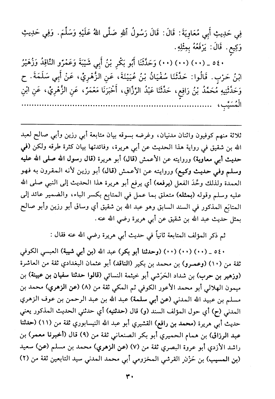 ٥٤٠ - (٠٠) (٠٠) (٠٠) (وحدثنا أبو بكر) عبد الله (بن أبي شيبة) العبسي الكوفي ثقة من (١٠) (وعمرو) بن محمد بن بكير (الناقد) أبو عثمان البغدادي ثقة من العاشرة (وزهير بن حرب) بن شداد الحَرَشي أبو خيثمة النسائي (قالوا حدثنا سفيان بن عيينة) بن ميمون الهلالي أبو محمد الأعور الكوفي ثم المكي ثقة من (٨) (عن الزهري) محمد بن مسلم بن عبيد الله المدني (عن أبي سلمة) عبد الله بن عبد الرحمن بن عوف الزهري المدني (ح) أي حول المؤلف السند (و) قال (حدثنيه) أي حدثني الحديث المذكور يعني حديث أبي هريرة (محمد بن رافع) القشيري أبو عبد الله النيسابوري ثقة من (١١) (حدثنا عبد الرزاق) بن همام الحميري أبو بكر الصنعاني ثقة من (٩) قال (أخبرنا معمر) بن راشد الأزدي أبو عروة البصري ثقة من (٧) (عن الزهري) محمد بن مسلم (عن) سعيد (بن المسيب) بن حَزْنِ القرشي المخزومي أبي محمد المدني سيد التابعين ثقة من (٢)