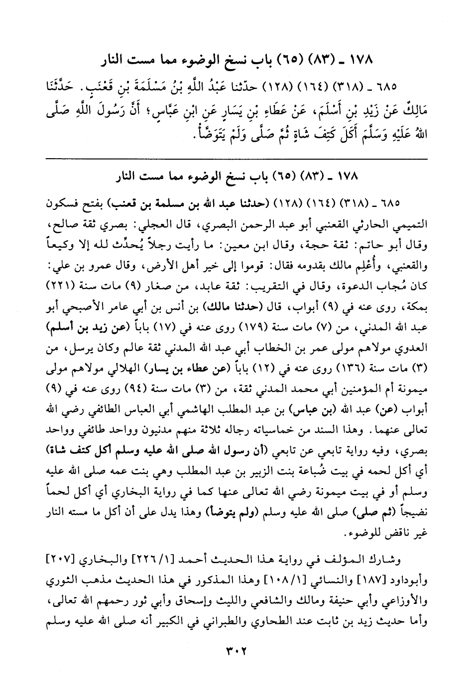 ٦٨٥ - (٣١٨) (١٦٤) (١٢٨) حدَّثنا عَبْدُ اللهِ بْنُ مَسْلَمَةَ بْنِ قَعْنَبٍ. حَدَّثَنَا مَالِك عَنْ زَيدِ بْنِ أَسْلَمَ، عَنْ عَطَاءِ بْنِ يَسَارٍ عَنِ ابْنِ عَبَّاسٍ؛ أَن رَسُولَ اللهِ صَلَّى اللهُ عَلَيهِ وَسَلَّمَ أَكَلَ كَتِفَ شَاةٍ ثُمَّ صَلَّى وَلَمْ يَتَوَضَّأْ