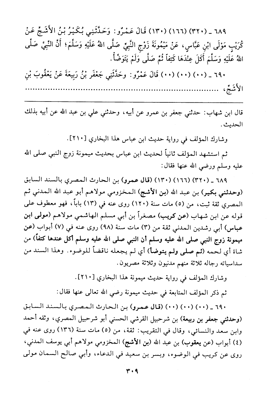 ٦٨٩ - (٣٢٠) (١٦٦) (١٣٠) قَال عَمْرٌو: وَحَدَّثَنِي بُكَيرُ بْنُ الأَشَجِّ عَنْ كُرَيبٍ مَوْلَى ابْنِ عَبَّاسٍ، عَنْ مَيمُونَةَ زَوْجِ النَّبِيِّ صَلَّى اللهُ عَلَيهِ وَسَلَّمَ؛ أَن النَّبِيِّ صَلَّى اللهُ عَلَيهِ وَسَلَّمَ أَكَلَ عِنْدَهَا كَتِفًا ثُمَّ صَلَّى وَلَمْ يَتَوَضَّأْ.