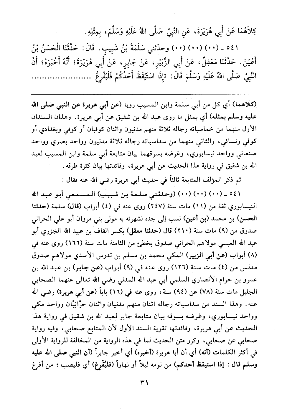 ٥٤١ - (٠٠) (٠٠) (٠٠) (وحدثني سلمة بن شبيب) المسمعي أبو عبد الله النيسابوري ثقة من (١١) مات سنة (٢٤٧) روى عنه في (٤) أبواب (قال) سلمة (حدثنا الحسن) بن محمد (بن أعين) نسب إلى جده لشهرته به مولى بني مروان أبو علي الحراني صدوق من (٩) مات سنة (٢١٠) قال (حدثنا معقل) بكسر القاف بن عبيد الله الجزري أبو عبد الله العبسي مولاهم الحراني صدوق يخطئ من الثامنة مات سنة (١٦٦) روى عنه في (٨) أبواب (عن أبي الزبير) المكي محمد بن مسلم بن تدرس الأسدي مولاهم صدوق مدلس من (٤) مات سنة (١٢٦) روى عنه في (٩) أبواب (عن جابر) بن عبد الله بن عمرو بن حرام الأنصاري السلمي أبي عبد الله المدني رضي الله تعالى عنهما الصحابي الجليل مات سنة (٧٨) عن (٩٤) سنة، روى عنه في (١٦) بابا (عن أبي هريرة) رضي الله عنه. وهذا السند من سداسياته رجاله اثنان منهم مدنيان واثنان حرَّانِيَّان وواحد مكي وواحد نيسابوري، وغرضه بسوقه بيان متابعة جابر لعبد الله بن شقيق في رواية هذا الحديث عن أبي هريرة، وفائدتها تقوية السند الأول لأن المتابع صحابي، وفيه رواية صحابي عن صحابي، وكرر متن الحديث لما في هذه الرواية من المخالفة للرواية الأولى في أكثر الكلمات (أنه) أي أن أبا هريرة (أخبره) أي أخبر جابرًا (أن النبي صلى الله عليه وسلم قال: إذا استيقظ أحدكم) من نومه ليلًا أو نهارًا (فليُفْرغ) أي فليصب؛ من أفرغ