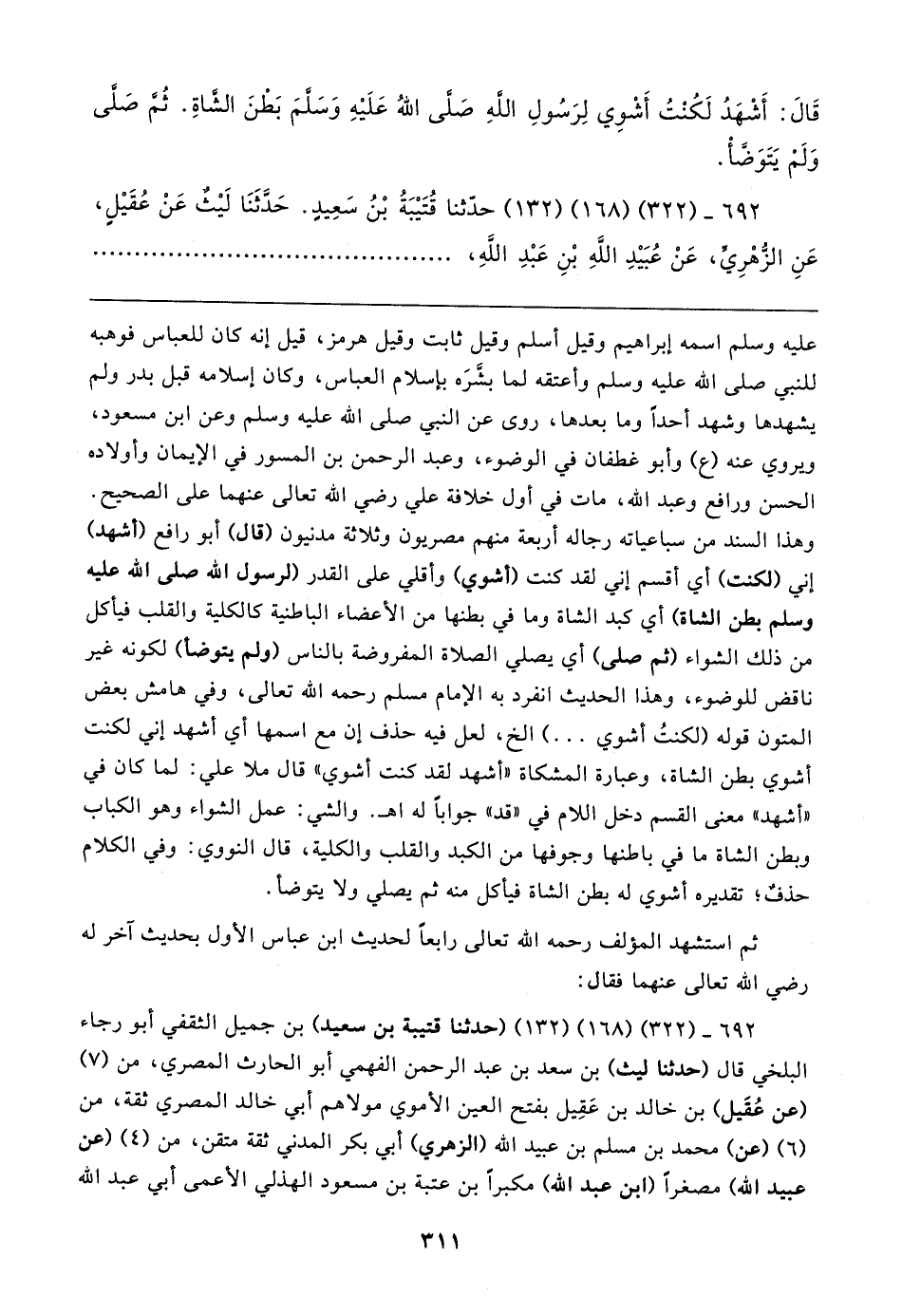 عليه وسلم اسمه إبراهيم وقيل أسلم وقيل ثابت وقيل هرمز، قيل إنه كان للعباس فوهبه للنبي صلى الله عليه وسلم وأعتقه لما بشَّرَه بإسلام العباس، وكان إسلامه قبل بدر ولم يشهدها وشهد أحدًا وما بعدها، روى عن النبي صلى الله عليه وسلم وعن ابن مسعود، ويروي عنه (ع) وأبو غطفان في الوضوء، وعبد الرحمن بن المسور في الإيمان وأولاده الحسن ورافع وعبد الله، مات في أول خلافة علي رضي الله تعالى عنهما على الصحيح. وهذا السند من سباعياته رجاله أربعة منهم مصريون وثلاثة مدنيون (قال) أبو رافع (أشهد) إني (لكنت) أي أقسم إني لقد كنت (أشوي) وأقلي على القدر الرسول الله صلى الله عليه وسلم بطن الشاة) أي كبد الشاة وما في بطنها من الأعضاء الباطنية كالكلية والقلب فيأكل من ذلك الشواء (ثم صلى) أي يصلي الصلاة المفروضة بالناس (ولم يتوضأ) لكونه غير ناقض للوضوء، وهذا الحديث انفرد به الإمام مسلم رحمه الله تعالى، وفي هامش بعض المتون قوله (لكنتُ أشوي ... ) الخ، لعل فيه حذف إن مع اسمها أي أشهد إني لكنت أشوي بطن الشاة، وعبارة المشكاة "أشهد لقد كنت أشوي" قال ملا علي: لما كان في "أشهد" معنى القسم دخل اللام في "قد" جوابًا له اهـ. والشي: عمل الشواء وهو الكباب وبطن الشاة ما في باطنها وجوفها من الكبد والقلب والكلية، قال النووي: وفي الكلام حذفٌ؛ تقديره أشوي له بطن الشاة فيأكل منه ثم يصلي ولا يتوضأ.