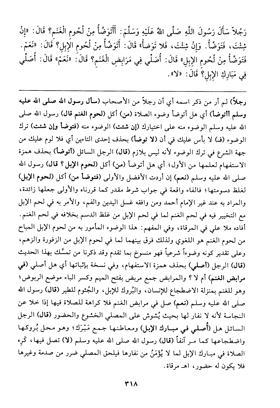 رَجُلًا سَأَلَ رَسُولَ اللهِ صَلَّى اللهُ عَلَيهِ وَسَلَّمَ: أَأَتَوَضَّأُ مِنْ لُحُومِ الْغَنَمِ؟ قَال: "إِنْ شِئْتَ، فَتَوَضَّأْ. وَإِنْ شِئْتَ، فَلا تَوَضأْ" قَال: أَتَوَضَّأُ مِنْ لُحُومِ الإِبِلِ؟ قَال: "نَعَمْ. فَتَوَضأْ مِنْ لُحُومِ الإِبِلِ" قَال: أصني فِي مَرَابِضِ الْغَنَمِ؟ قَال: "نَعَمْ" قَال: أُصلِّي فِي مَبَارِكِ الإِبِلِ؟ قَال: "لا"