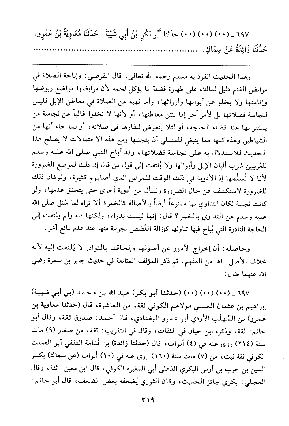 ٦٩٧ - (٠٠) (٠٠) (٠٠) (حدثنا أبو بكر) عبد الله بن محمد (بن أبي شيبة) إبراهيم بن عثمان العبسي مولاهم الكوفي ثقة، من العاشرة، قال (حدثنا معاوية بن عمرو) بن المُهلَّب الأزدي أبو عمرو البغدادي، قال أحمد: صدوق ثقة، وقال أبو حاتم: ثقة، وذكره ابن حبان في الثقات، وقال في التقريب: ثقة، من صغار (٩) مات سنة (٢١٤) روى عنه في (٤) أبواب، قال (حدثنا زائدة) بن قُدامة الثقفي أبوالصلت الكوفي ثقة ثبت، من (٧) مات سنة (١٦٠) روى عنه في (١٠) أبواب (عن سماك) بكسر السين بن حرب بن أوس البكري الذهلي أبي المغيرة الكوفي، قال ابن معين: ثقة، وقال العجلي: بكري جائز الحديث، وكان الثوري يُضعفه بعض الضعف، قال أبو حاتم: